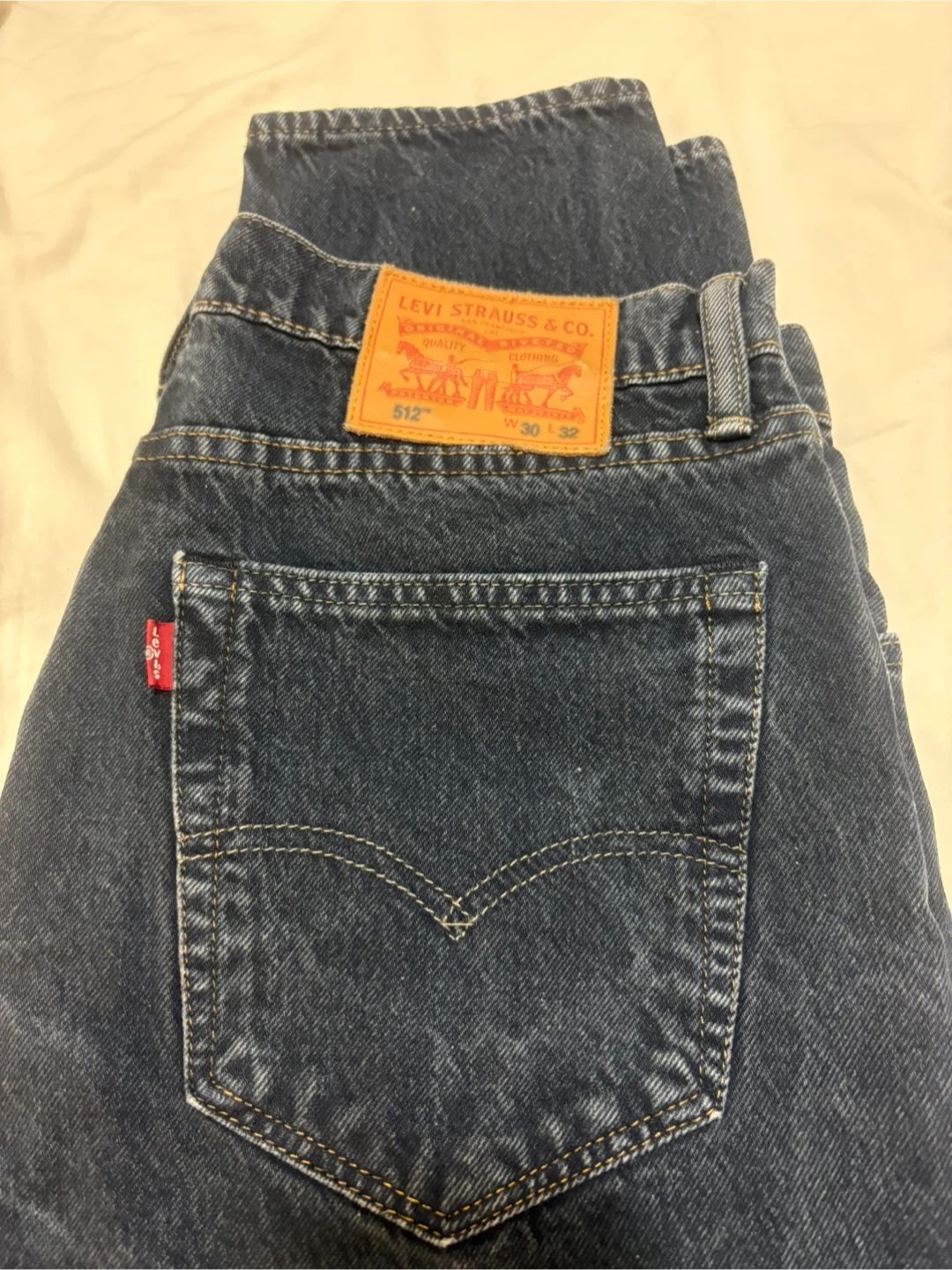 These are Levi's 512 jeans. These jeans are made from dark denim (navy blue).