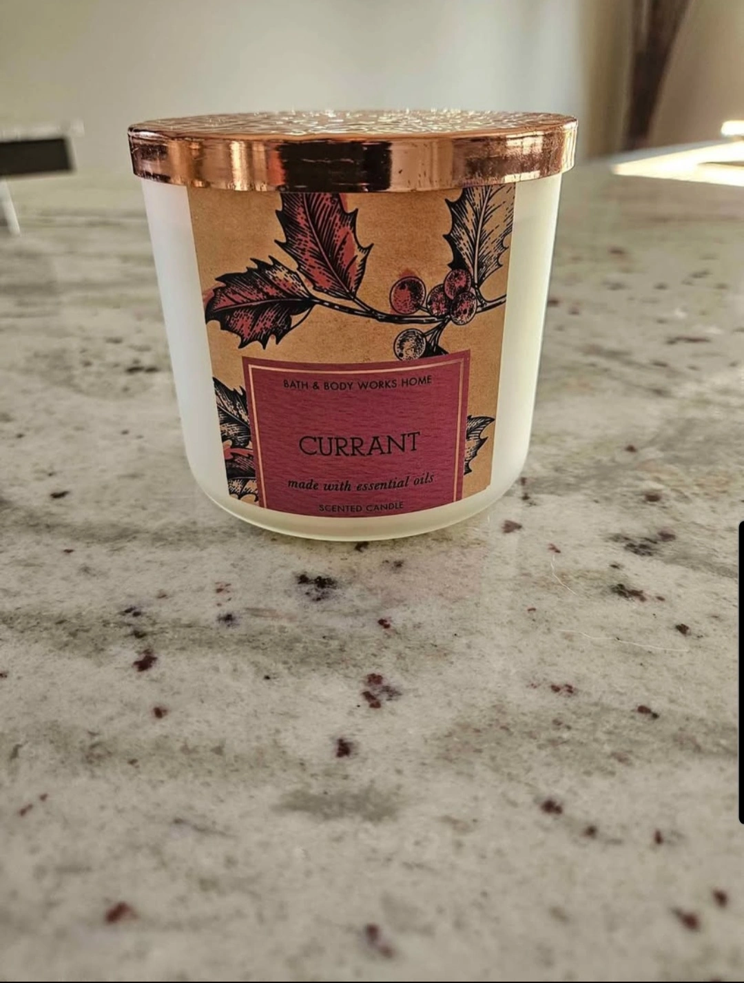 Selling a Bath & Body Works Home scented candle in the Currant scent! It's made with essential oils and would be perfect for creating a cozy atmosphere in your home