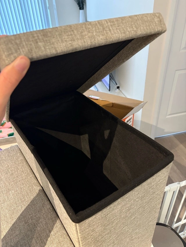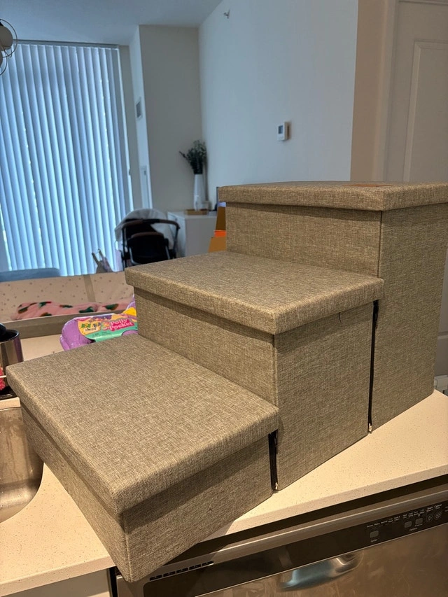 These Zerbuger dog stairs with storage are new. They feature three steps in a grey fabric, and each step opens up for storage. They are foldable and can be easily stored when not in use. These stairs are perfect for small to medium-sized dogs or cats, providing a safe and easy way for them to reach their favourite spots. If the ad is up, it's available! Cash accepted.