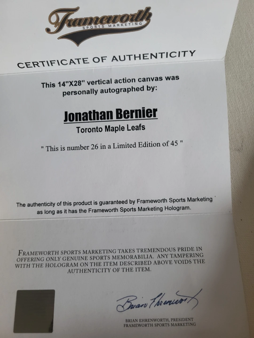 Selling a Frameworth Sports Marketing autographed canvas featuring Jonathan Bernier of the Toronto Maple Leafs. It's a 14"x28" vertical action canvas and is number 26 in a limited edition of 45. Comes with a certificate of authenticity from Frameworth Sports Marketing