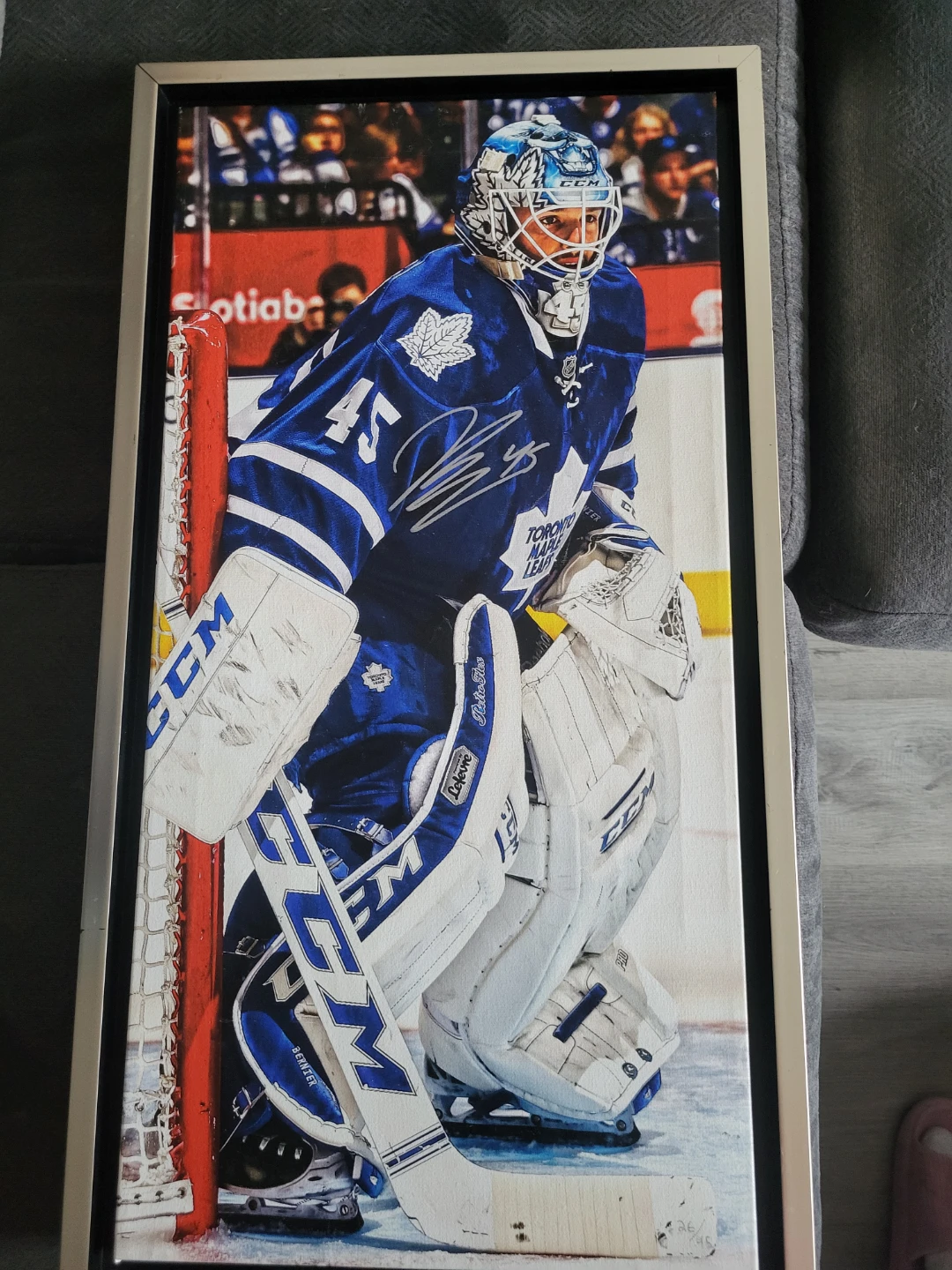 Selling a Frameworth Sports Marketing autographed canvas featuring Jonathan Bernier of the Toronto Maple Leafs. It's a 14"x28" vertical action canvas and is number 26 in a limited edition of 45. Comes with a certificate of authenticity from Frameworth Sports Marketing