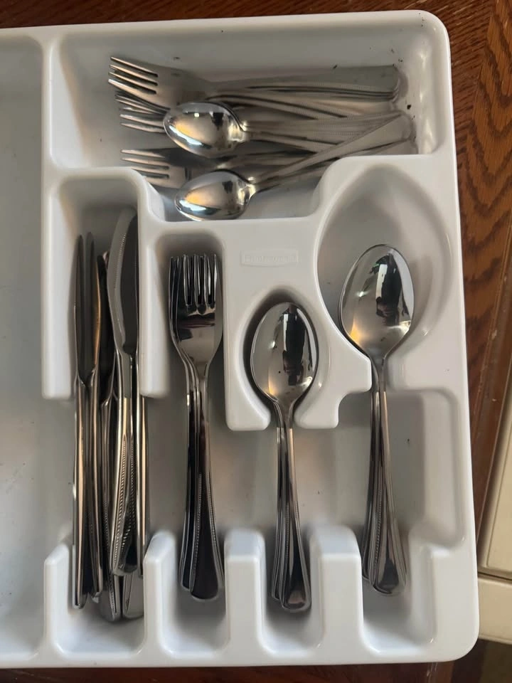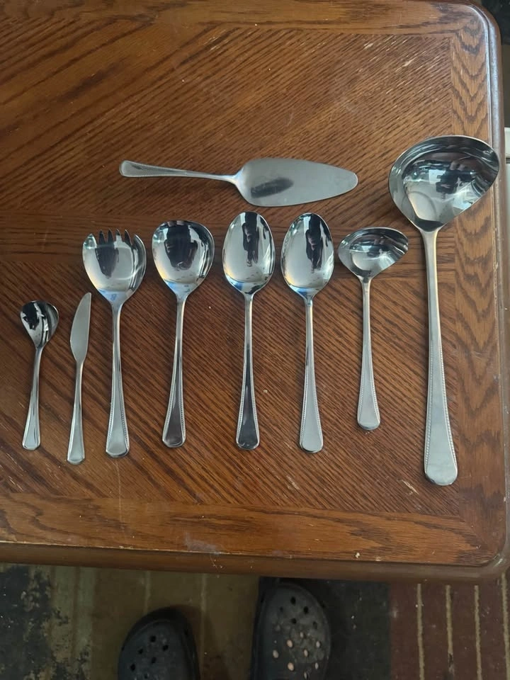 Amefa stainless steel cutlery set for 8 place settings (48 pieces plus 9 piece serving set) for a total of 57 pieces. This brand originates from Holland and is well-regarded for its durability, ergonomic design, and value. Reliable, rust-resistant, and suitable for both daily use and special occasions.