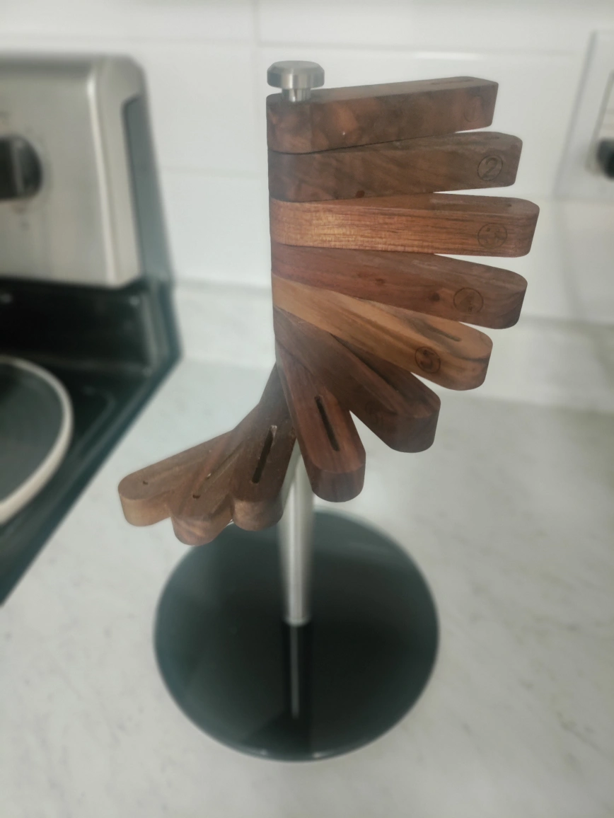 Looking to declutter your kitchen counter? This rotating wooden knife block stand is a stylish and space-saving solution for storing your knives. It's in great condition and ready for a new home!