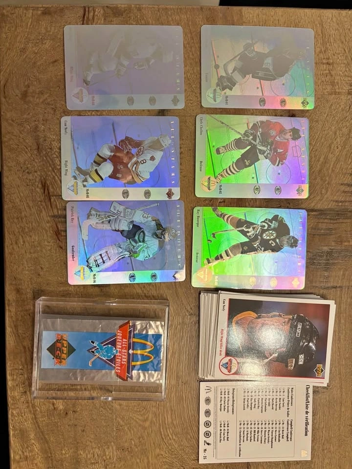 Complete Upper Deck McDonald’s NHL hockey card set in excellent condition. Includes the full base set and all 6 hologram cards. The original checklist is also included, along with a bonus McDonald’s All-Star promo card in a protective case. Cards have been safely stored in sleeves. A great collectible for hockey fans or card collectors. The hologram cards display very nicely and the overall set appears well cared for. Condition: Very good to excellent. Pickup: Edmonton area.