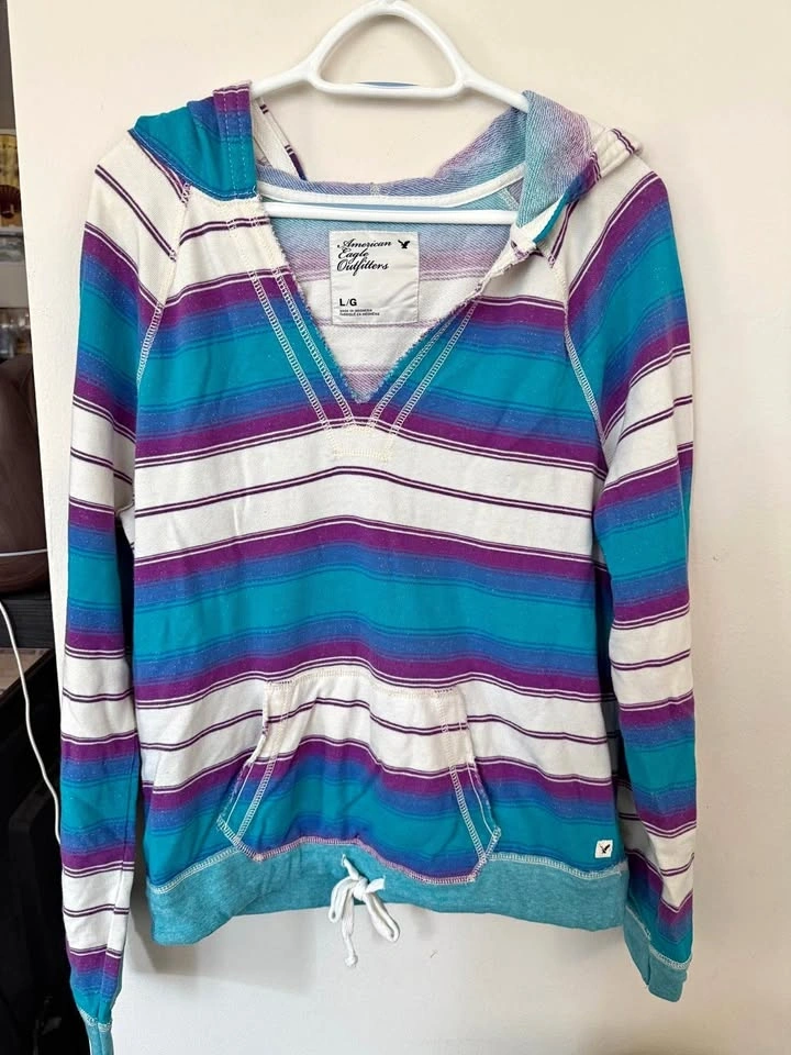 Women's American Eagle Beachy Y2K Striped V Neck Hoodie size large. Perfect for the beach, so cute with a skirt or shorts. 100% cotton. In excellent condition. I have posted other tshirts, hoodies and pants for sale on my profile, feel free to check those out!