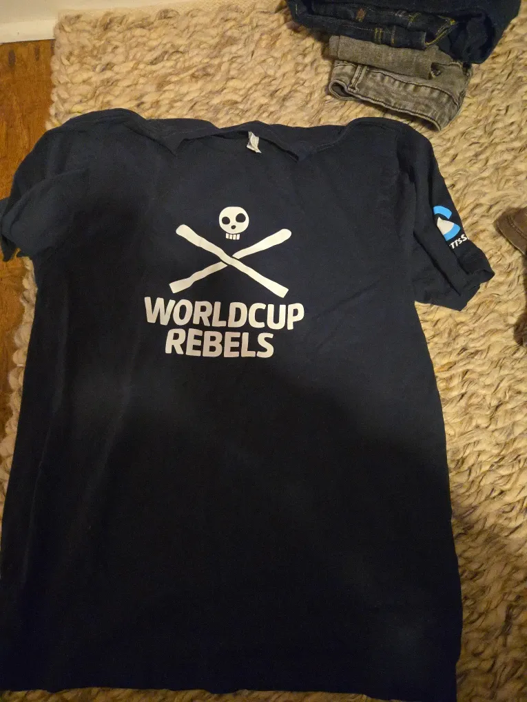 Selling a black Worldcup Rebels t-shirt. It features a skull and crossbones design with the words "Worldcup Rebels" printed on the front. The shirt also has a logo on the sleeve. It's in good condition and ready for a new owner!