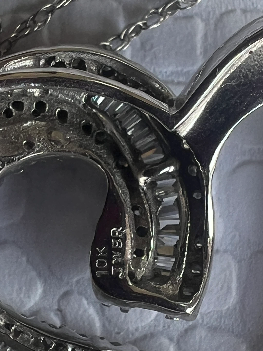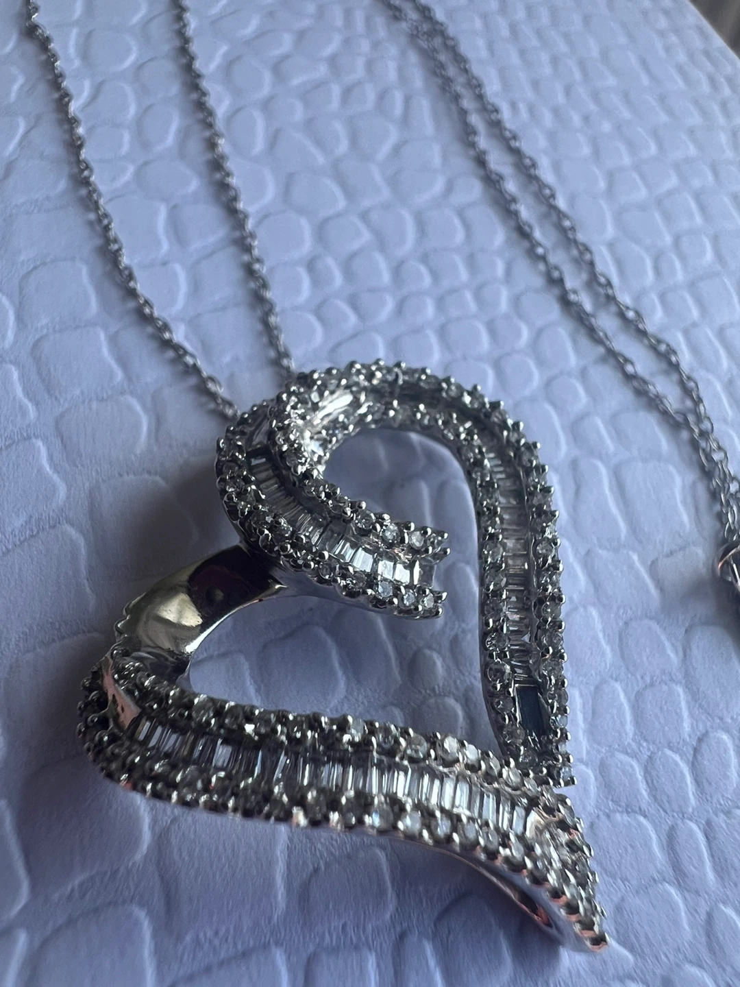 Sparkling heart pendant necklace crafted from 10K white gold. It features a cluster of baguette and round diamonds. Chain length approximately 18 inches. A lovely piece for any occasion!