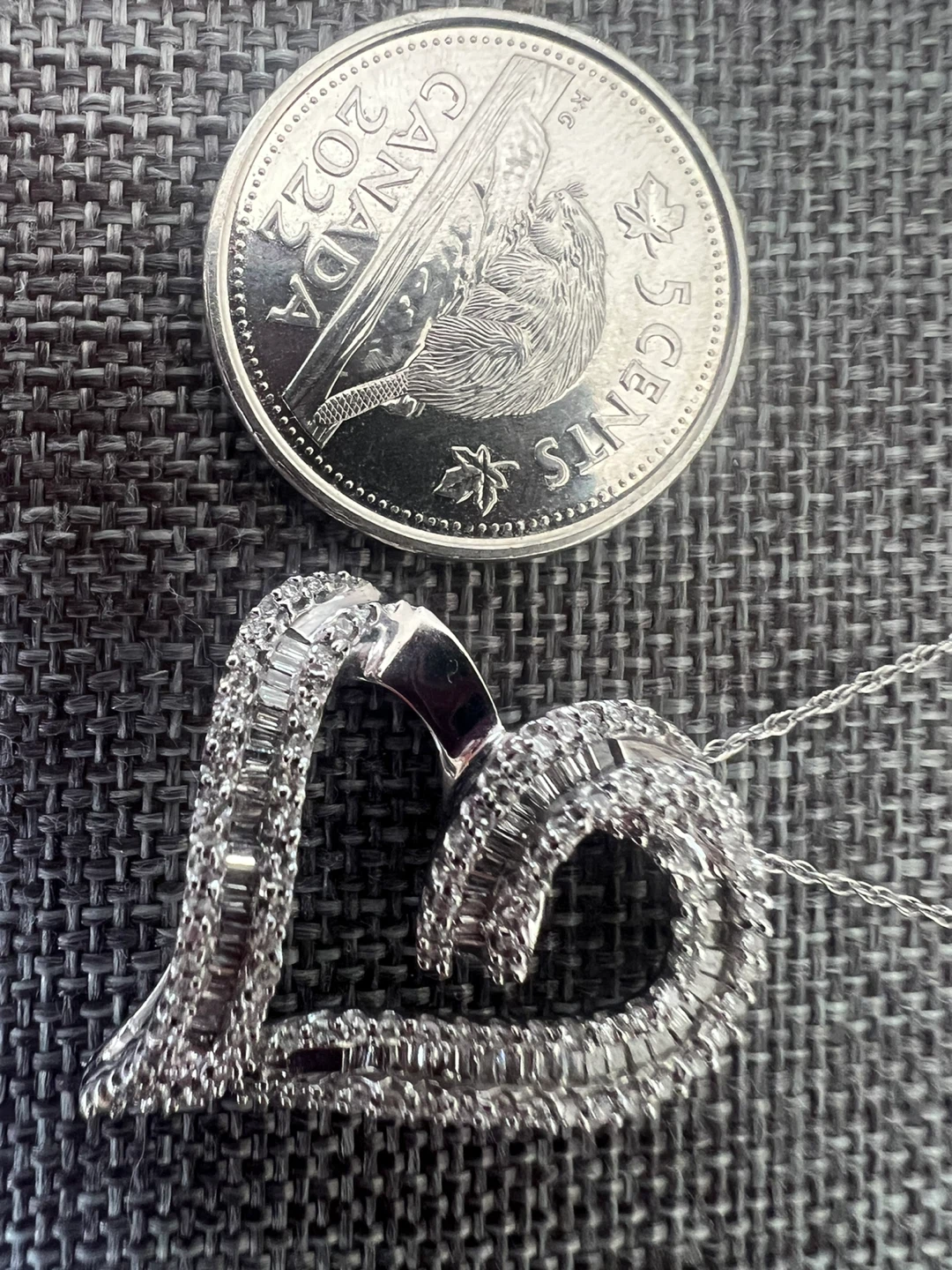 Sparkling heart pendant necklace crafted from 10K white gold. It features a cluster of baguette and round diamonds. Chain length approximately 18 inches. A lovely piece for any occasion!