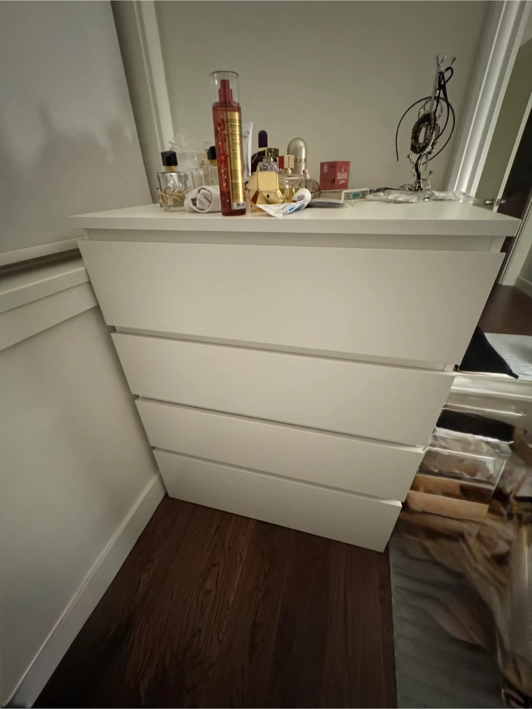 White IKEA STORKLINTA 4-drawer chest. Dimensions are 70x48x98 cm. It's a nice piece for organizing your stuff!