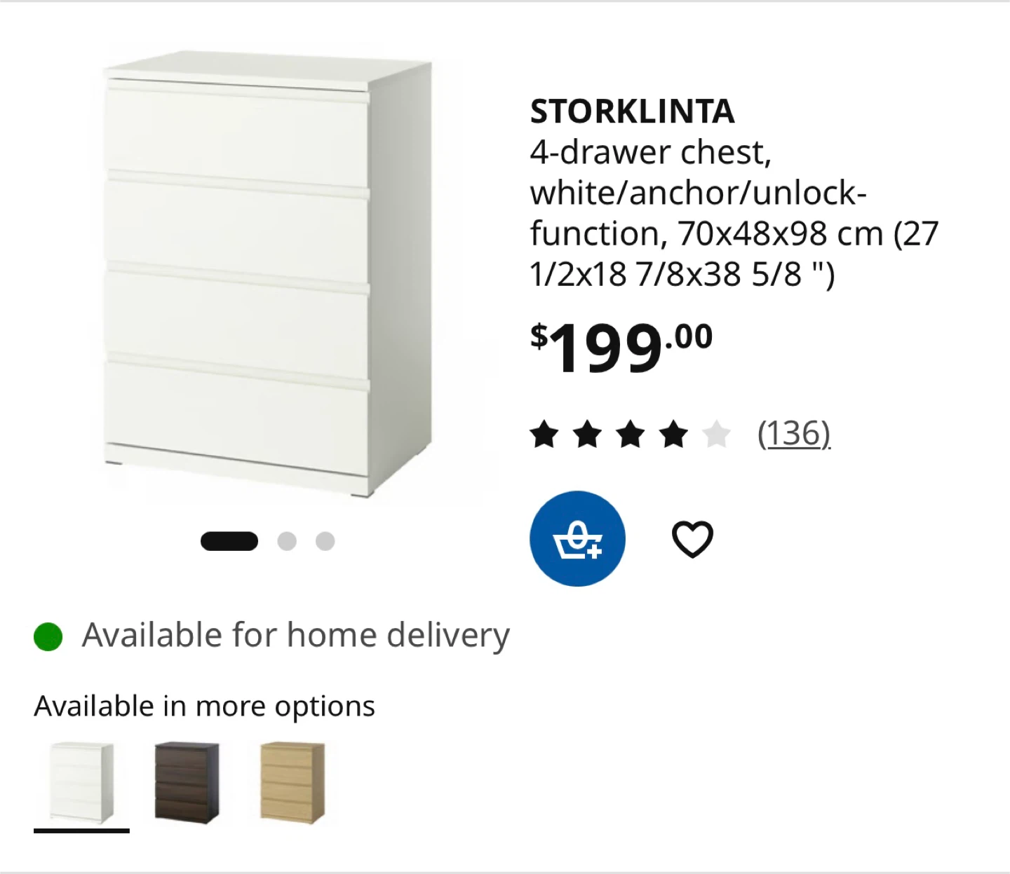 White IKEA STORKLINTA 4-drawer chest. Dimensions are 70x48x98 cm. It's a nice piece for organizing your stuff!