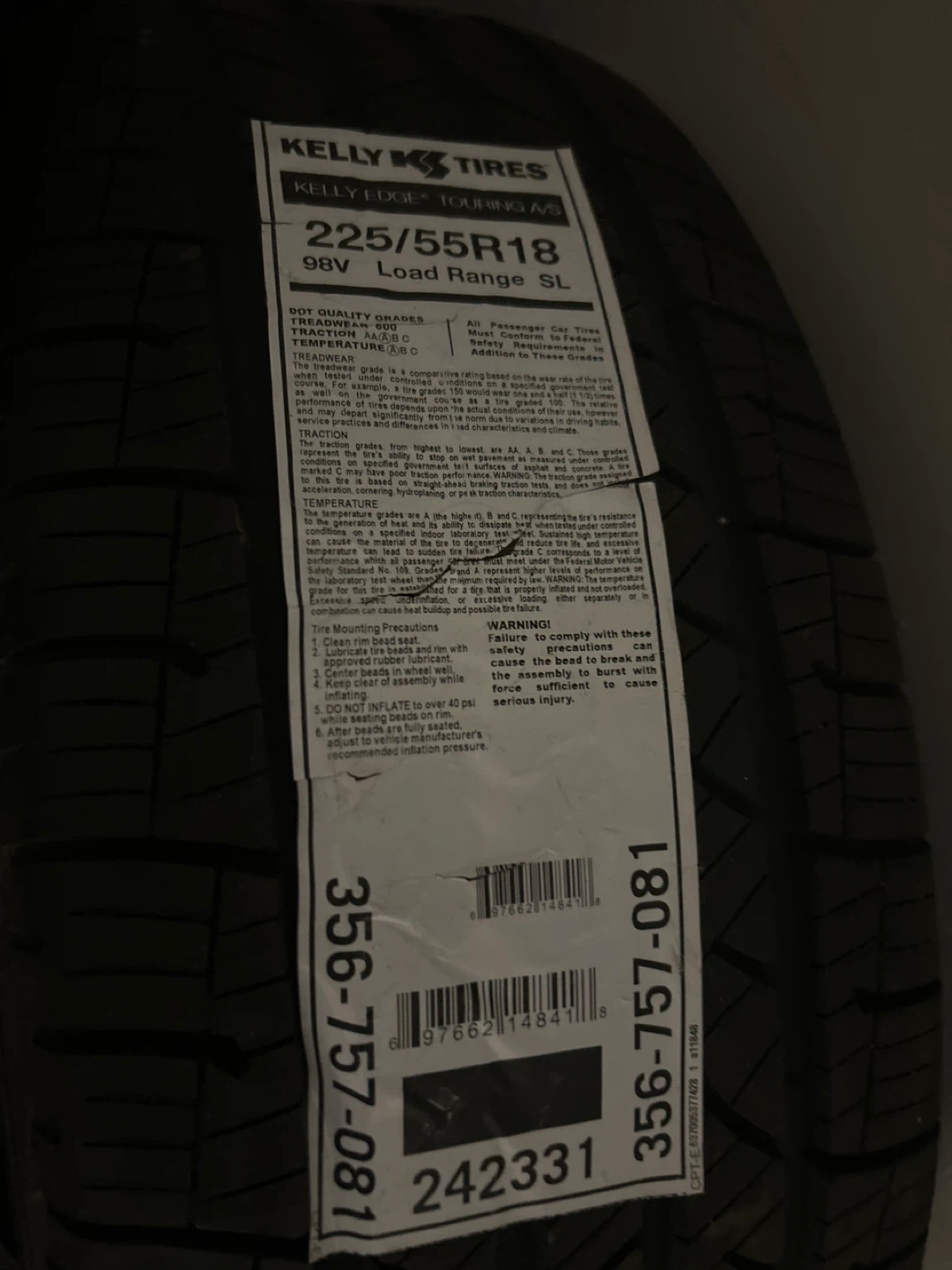 Selling two Kelly Edge Touring A/S tires with a size of 225/55R18 and a load range of 98V SL. They're designed for all-season passenger car use. This tire features a treadwear grade of 600, traction grade of B, and temperature grade of B.