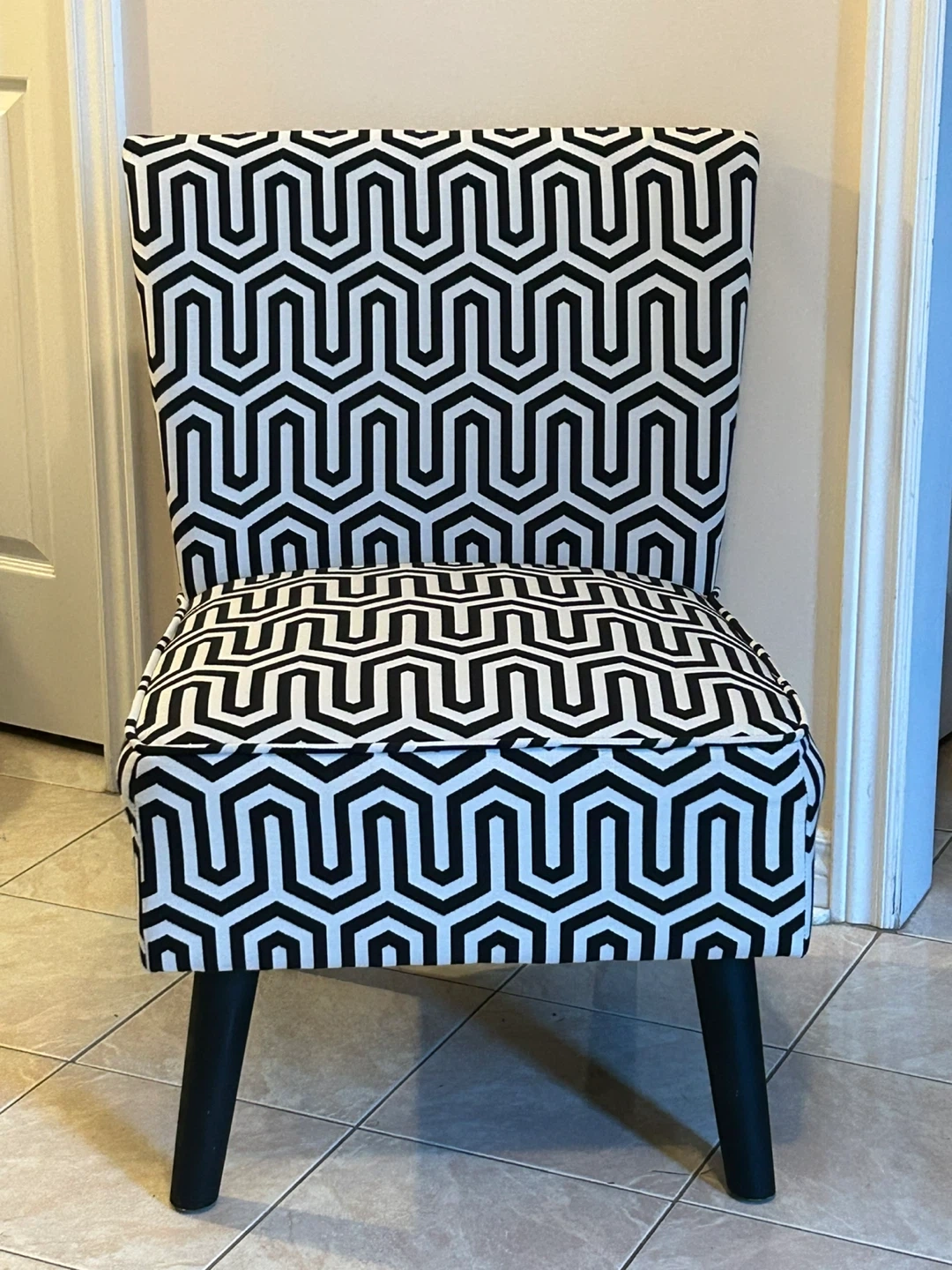 This accent chair features a striking black and white geometric pattern upholstery. It has four black wooden legs and a comfortable seat and backrest. Its compact size makes it suitable for smaller spaces.