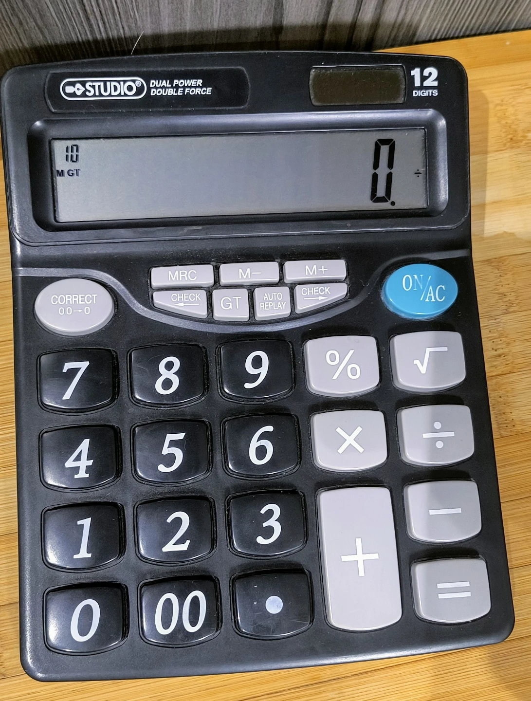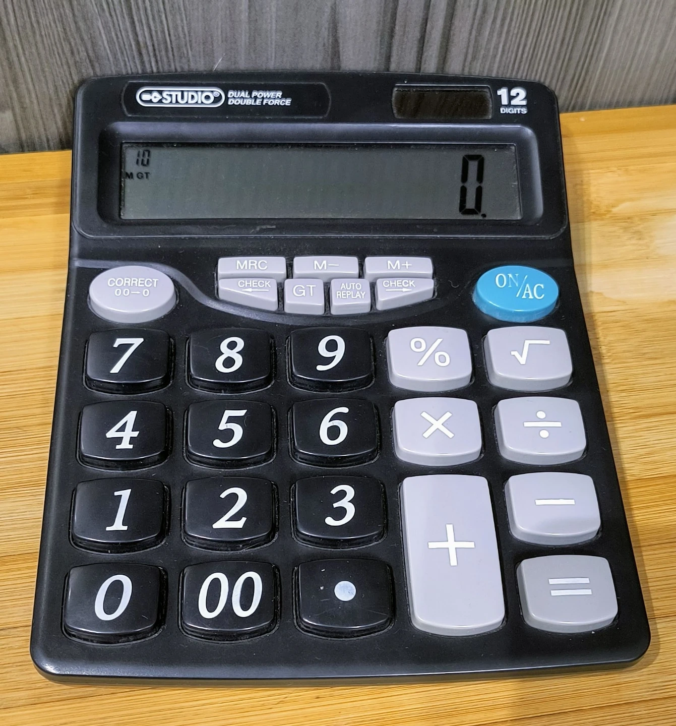 This is a Studio dual power calculator with a 12-digit display. It features large buttons and an easy-to-read screen. It's great for everyday calculations at home or in the office.