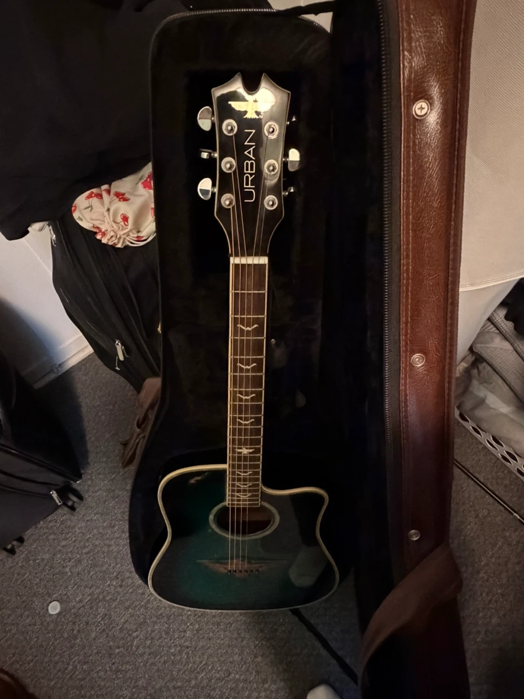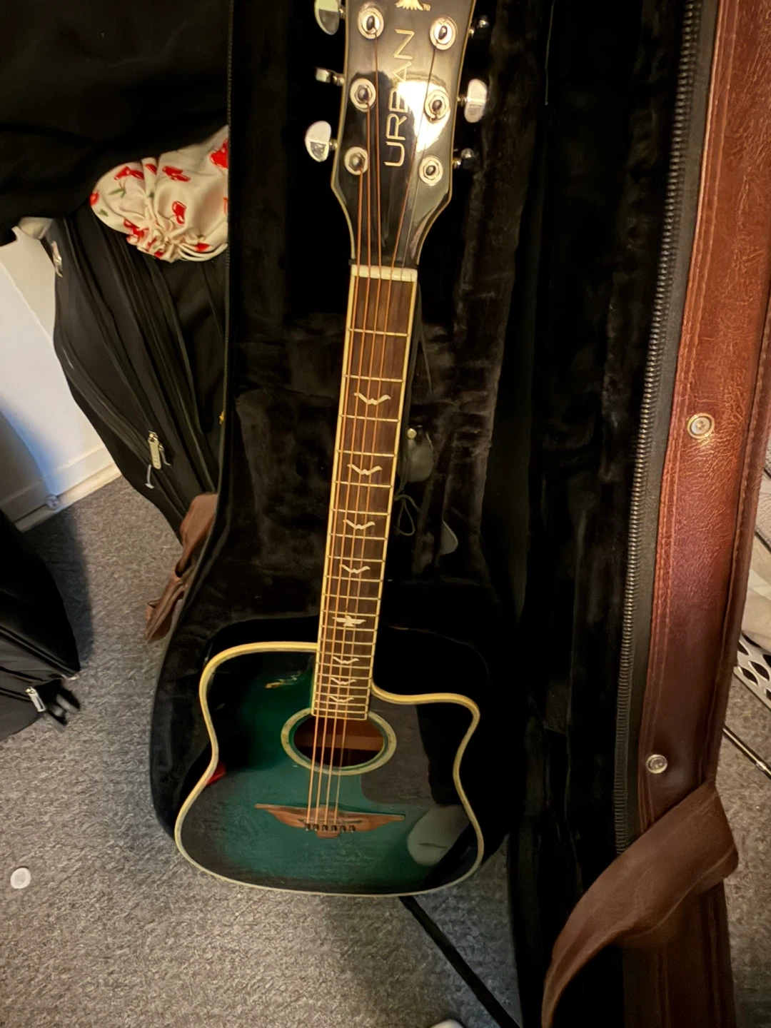 This is an Urban acoustic electric guitar. It features a sunburst green finish and comes with a brown hard shell case. It has a pickup for amplification. Great for guitarists of all levels!