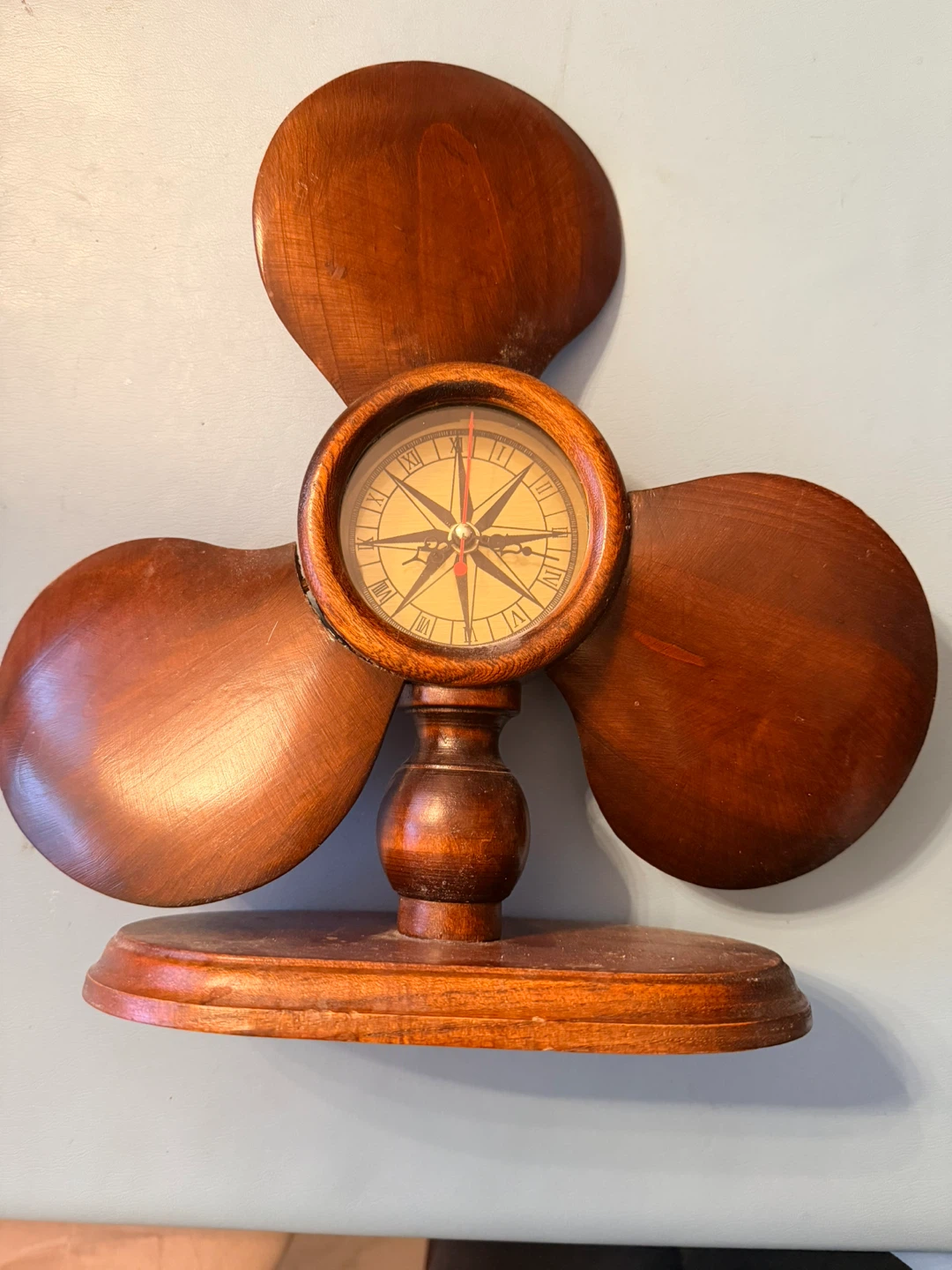 This decorative item features a wooden propeller design with a functioning compass at its centre. It's made of dark, polished wood. This piece would suit a nautical-themed room or office.