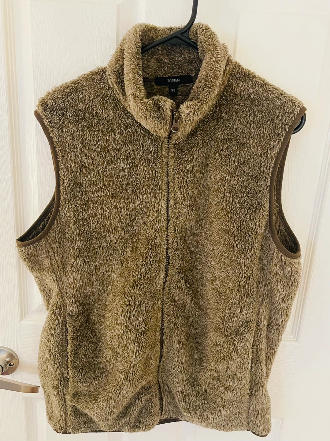 Brown fuzzy fleece vest from TOP TEN. Full zip front closure. It's a size 100. Perfect for layering on cooler days!