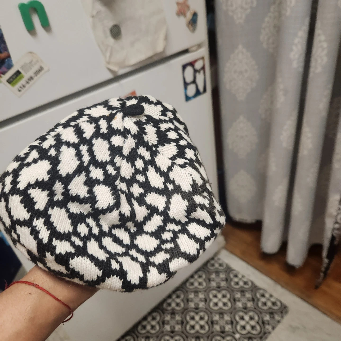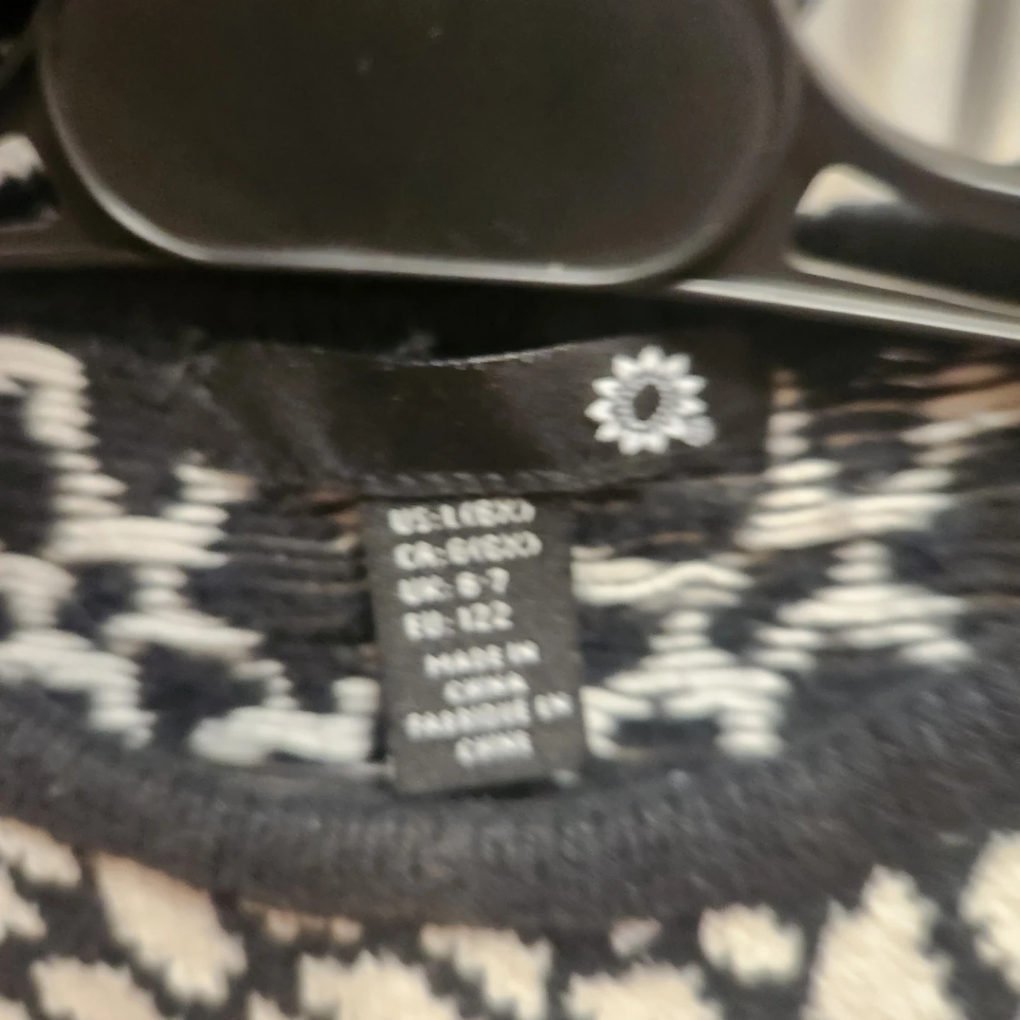 This is a knitted sweater dress with a black and white abstract pattern. It features short sleeves and a black ribbed collar and waistband with a small black buckle detail.