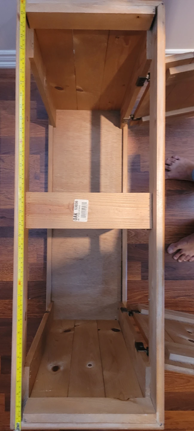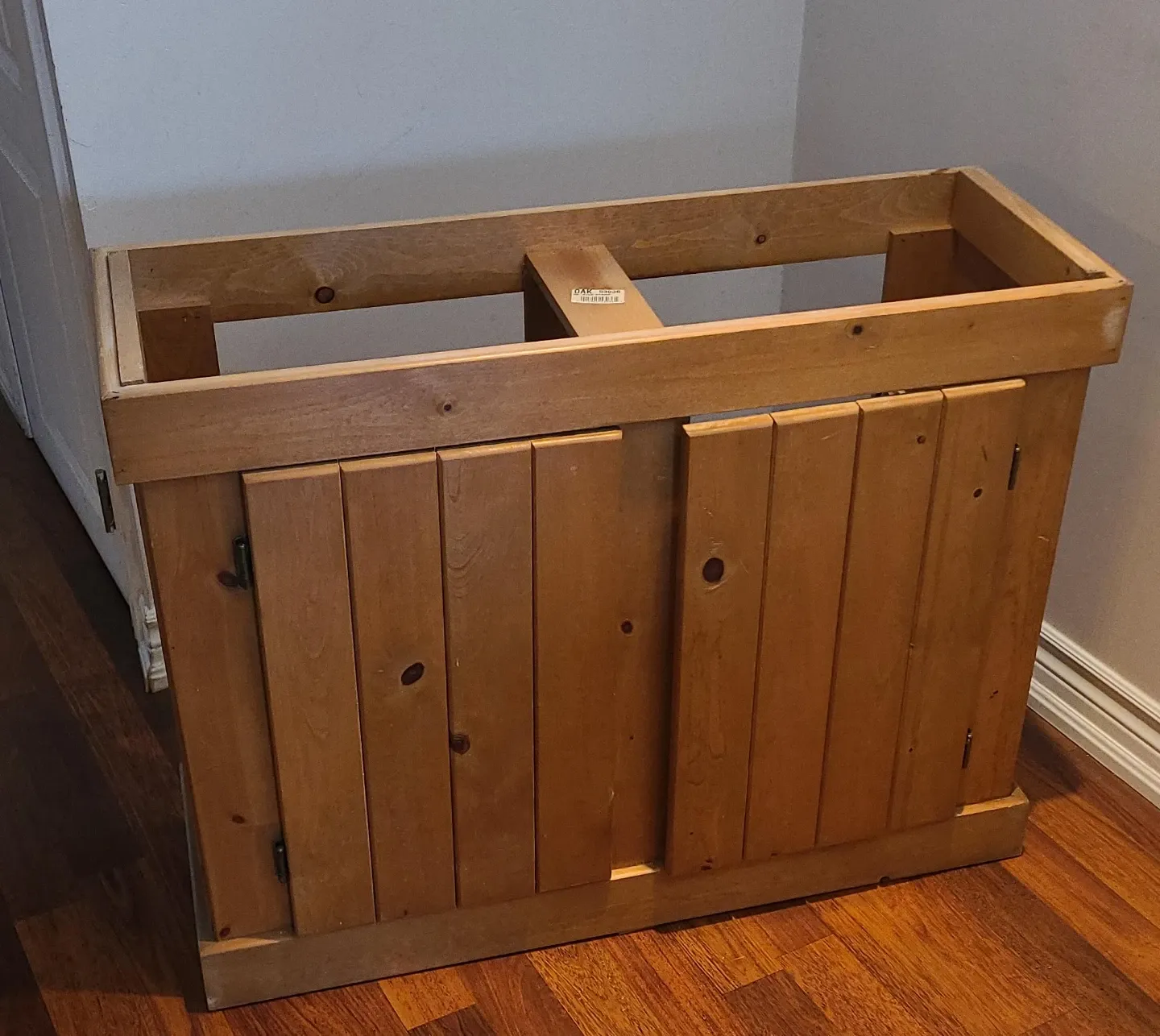 Wooden pine stand with two doors. It measures 36 inches in length. This stand is suitable for a 29 gallon or 30 gallon fish tank. See photos for measurements.