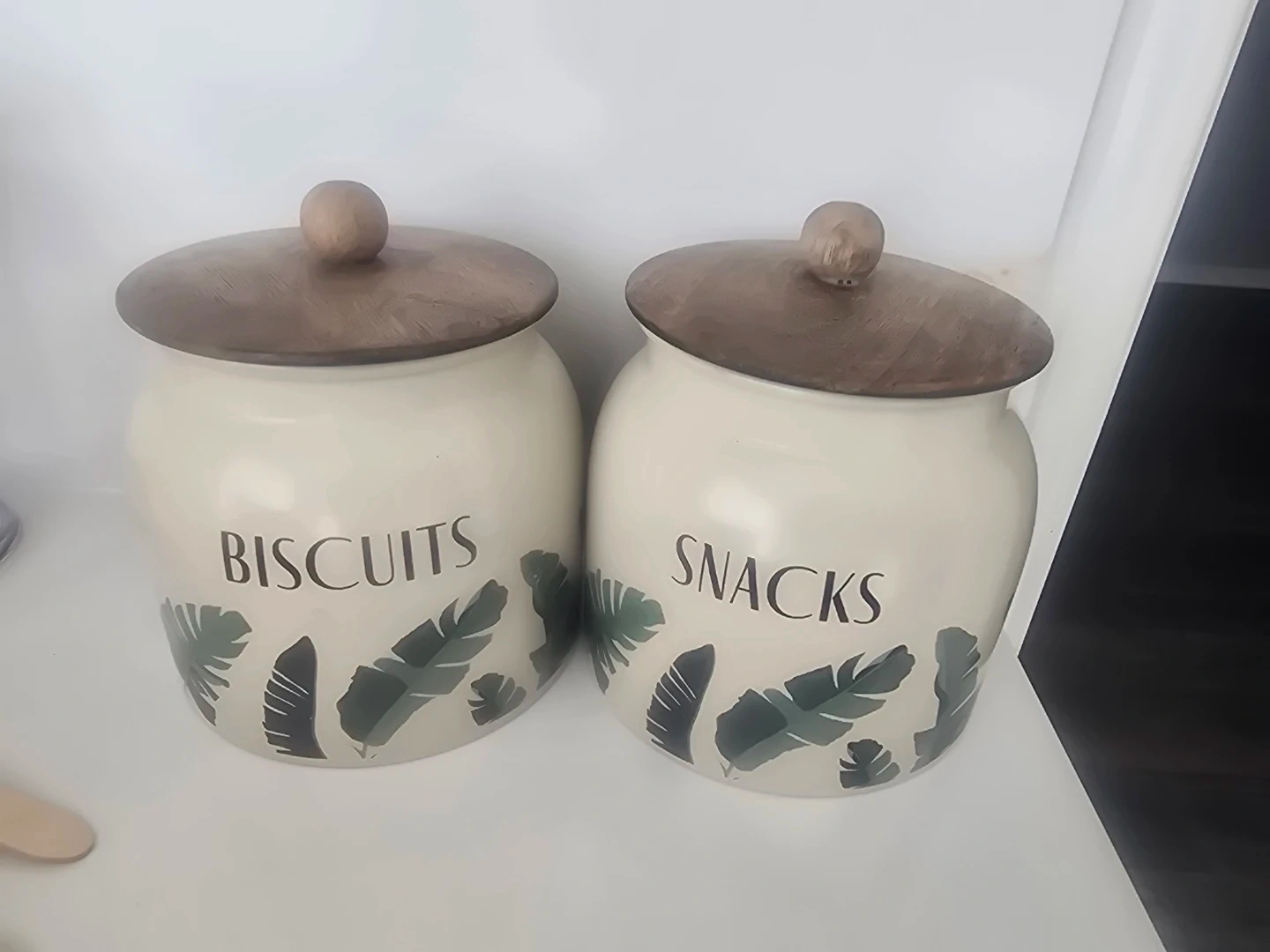 This set includes two decorative canisters, one labelled "Biscuits" and the other "Snacks". Each canister features a light cream-coloured body with a tropical leaf pattern. They come with rustic wooden lids, each topped with a small wooden knob. These canisters are great for keeping your baked goods and other treats fresh and accessible!