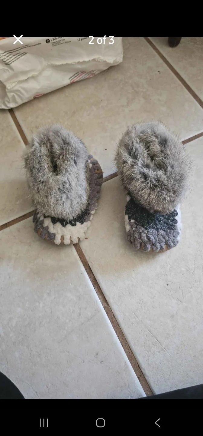 Adorable, handmade crocheted baby boots featuring cozy fur pompoms. The boots have a grey, white, and black striped crochet pattern. They're soft and perfect for keeping little feet warm.
