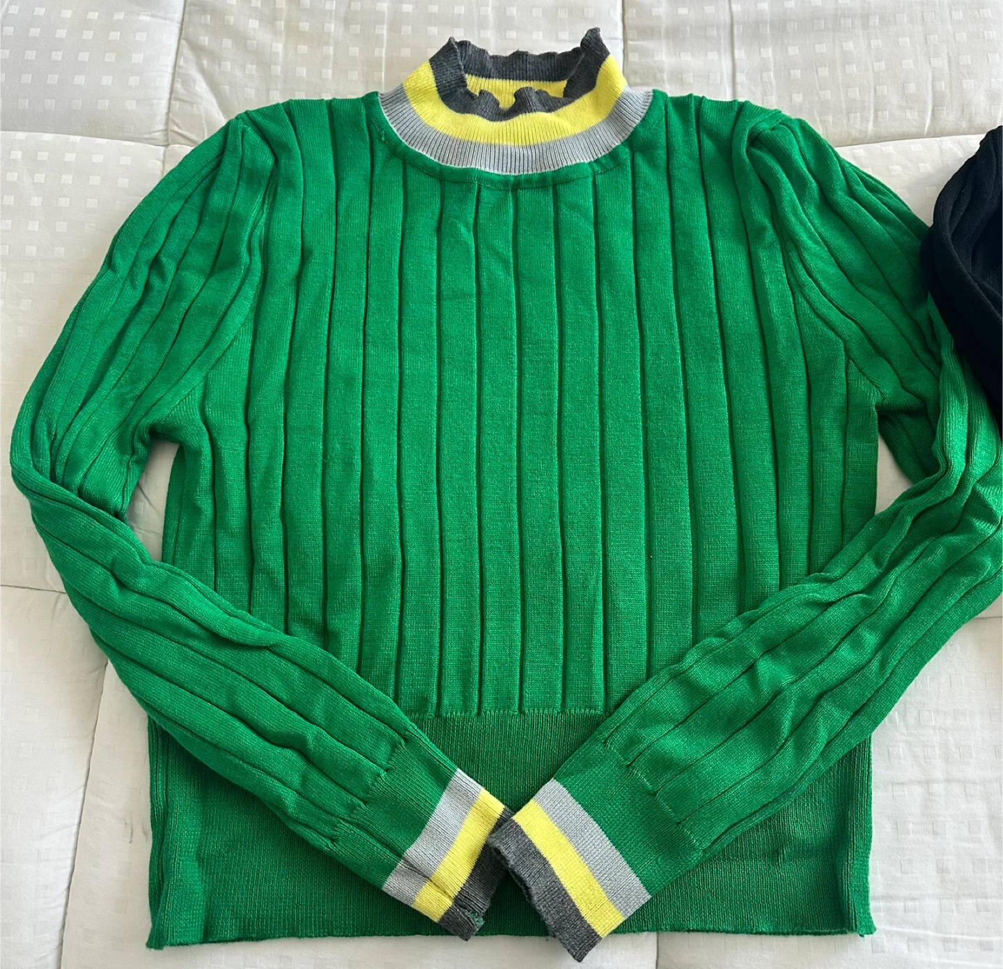 Selling two ribbed knit sweaters. Stretchable materials. One is a vibrant green and the other is classic black. Both feature a stylish mock neck design with unique colour accents. They're in excellent condition and have never been worn.