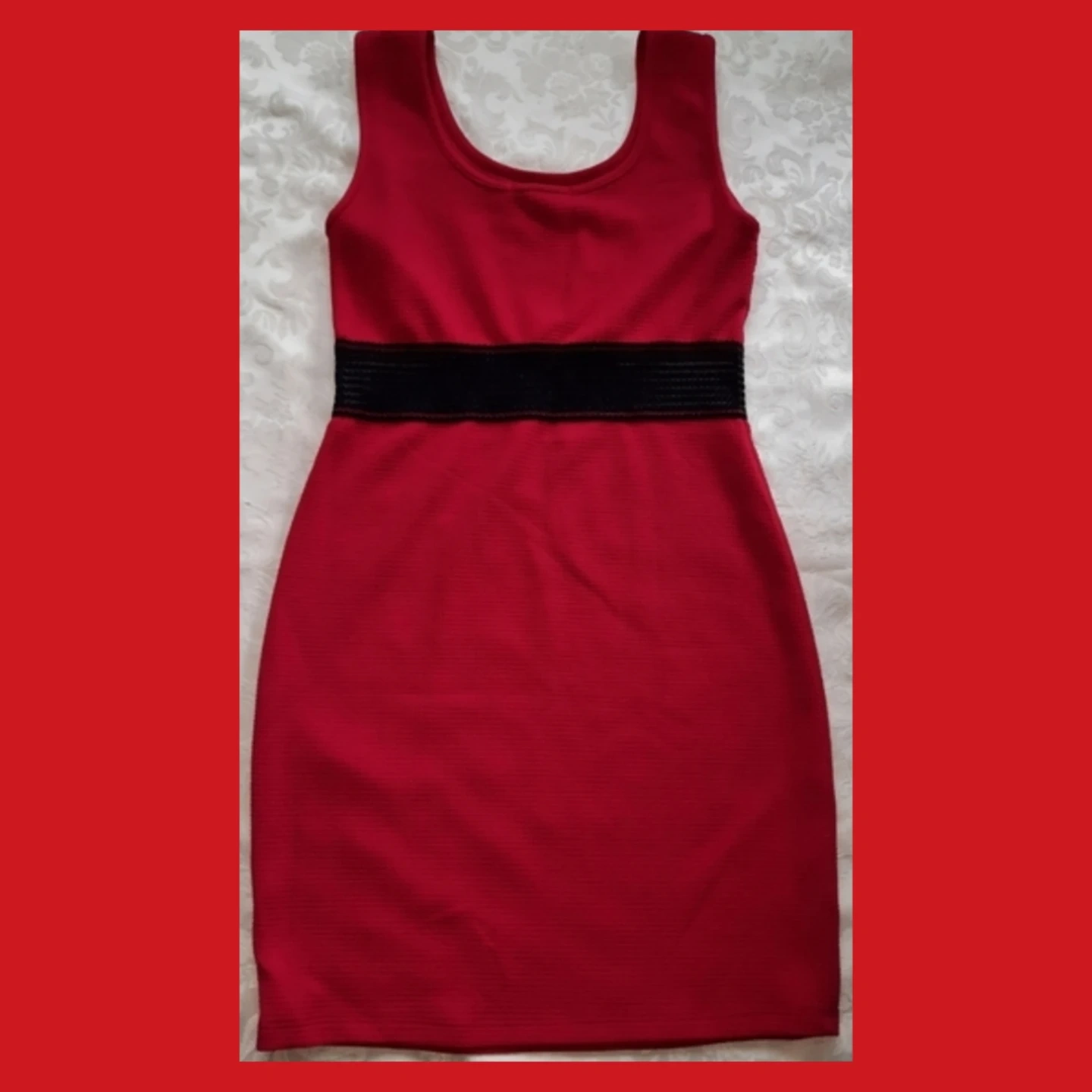This is a red sleeveless dress with a black elasticated band at the waist. It features a textured fabric. It's suitable for a night out or a special occasion!