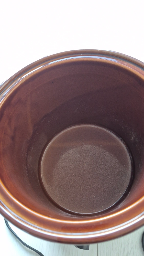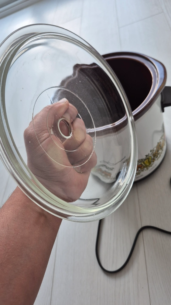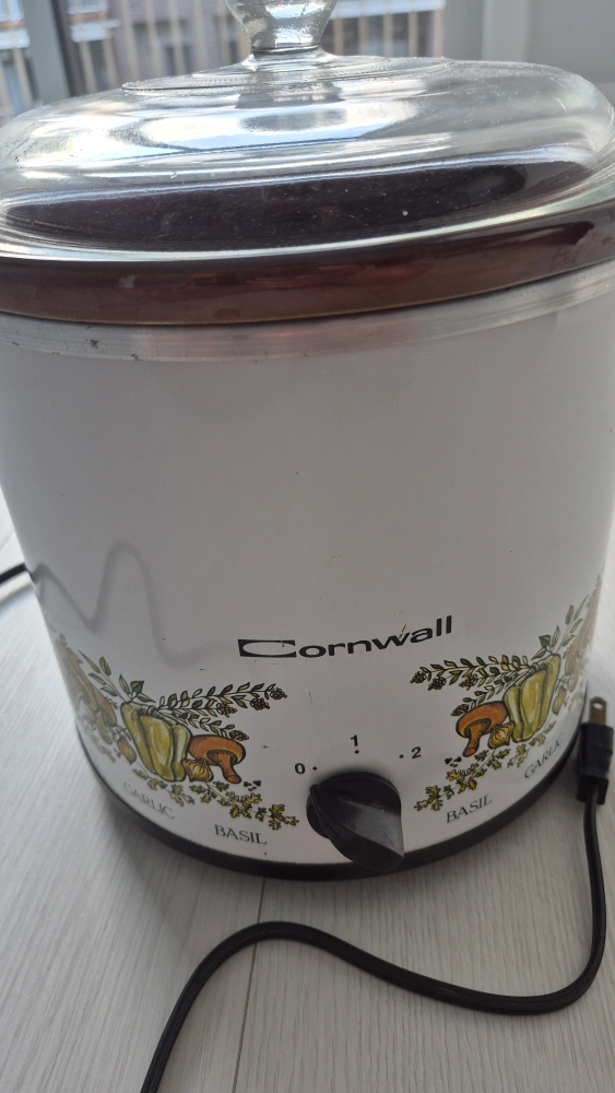 Selling a vintage slow cooker! It has a white exterior with a cute vegetable design around the base. The inside is a nice brown ceramic, and it comes with a clear glass lid. Perfect for making soups and stews on a chilly day