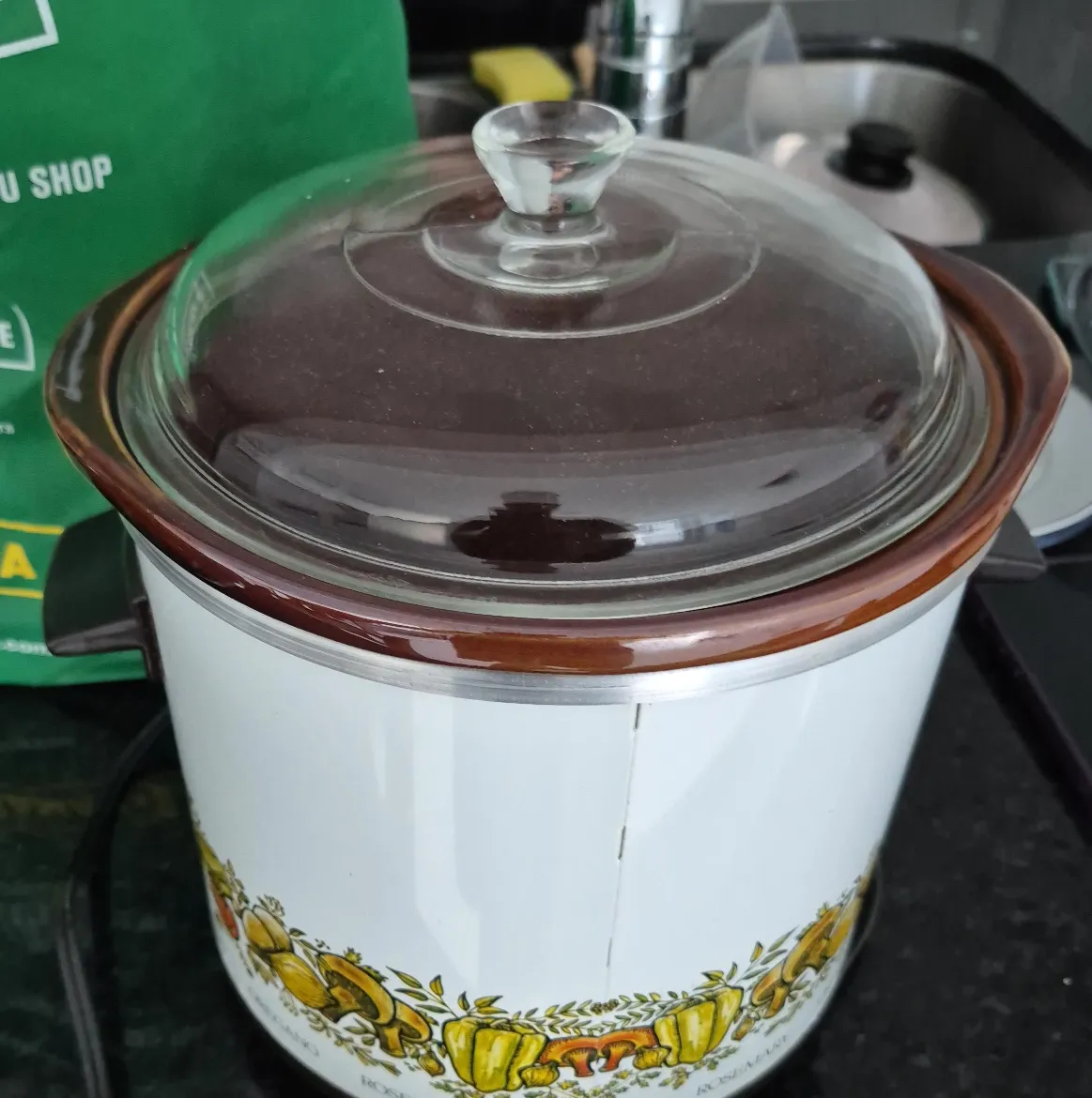 Selling a vintage slow cooker! It has a white exterior with a cute vegetable design around the base. The inside is a nice brown ceramic, and it comes with a clear glass lid. Perfect for making soups and stews on a chilly day