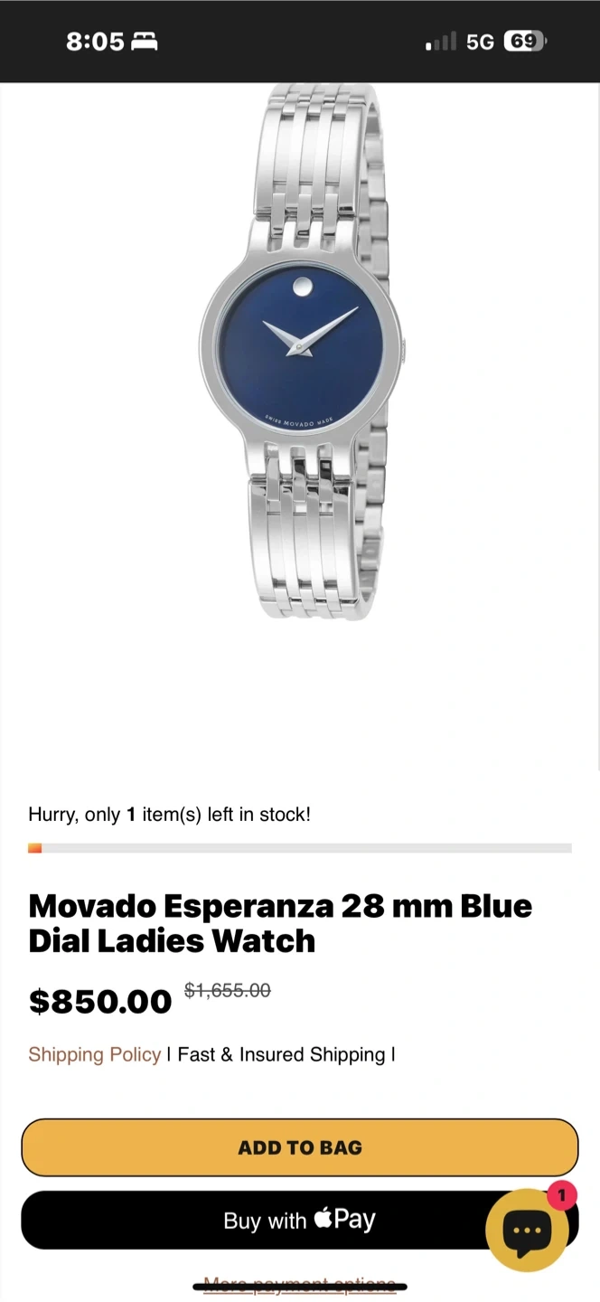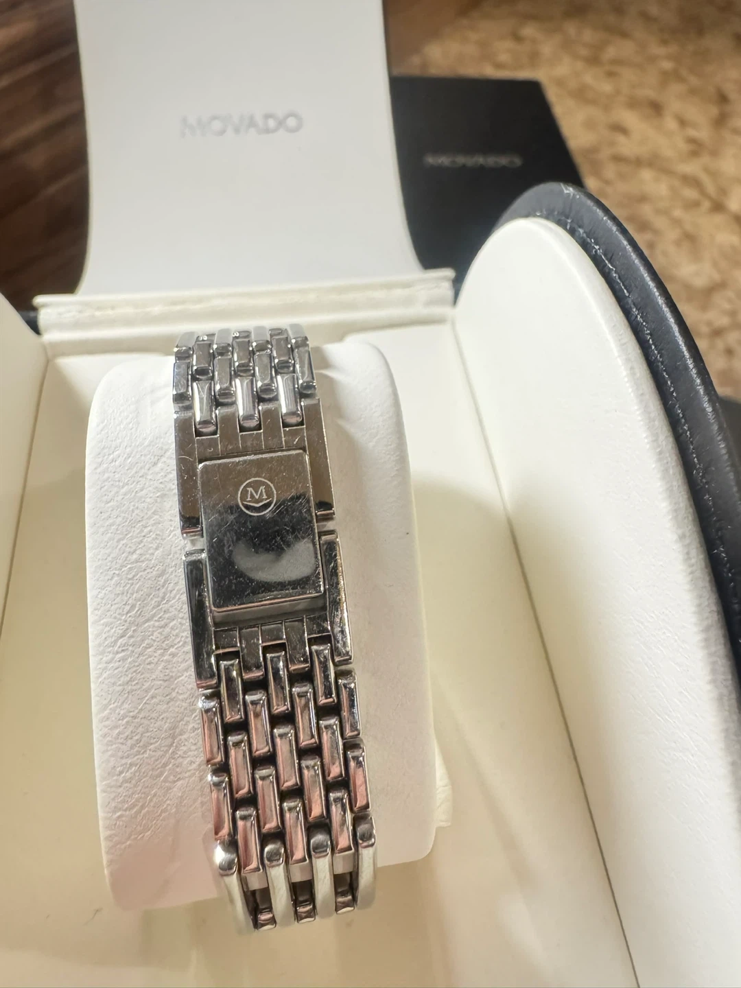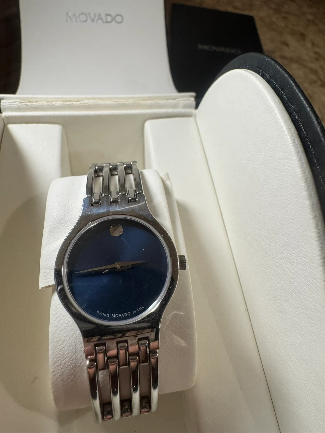 Movado Esperanza watch with a stainless steel band and blue dial. It's water-resistant with a sapphire crystal. Includes original box, operating instructions, and extra links.