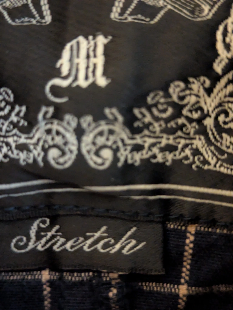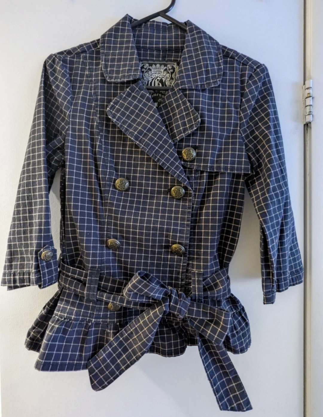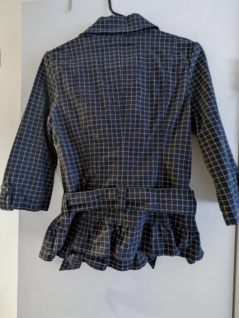 Navy blue and white plaid blazer with a belt that can be removed. Three-quarter sleeves with button cuffs. Double breasted with brass buttons. Stretchy cotton material for comfort. In very clean, gently worn condition.