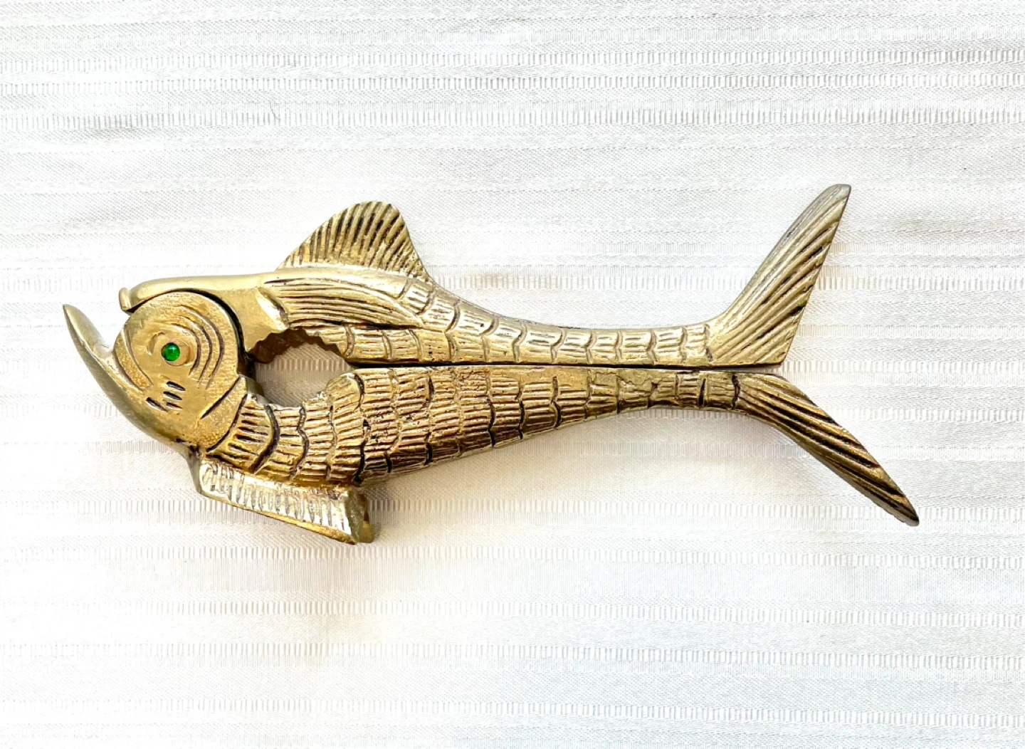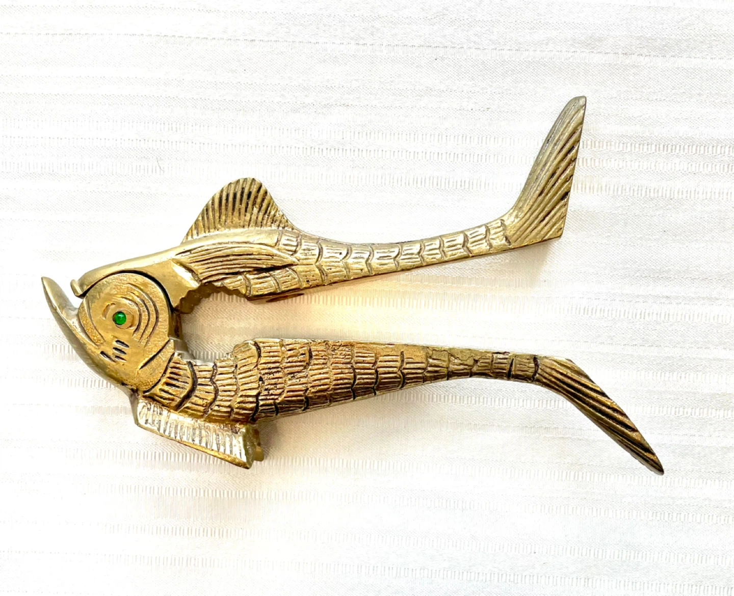 Vintage golden solid brass metal nutcracker zoomorphic fish with detailed scales and green eyes.