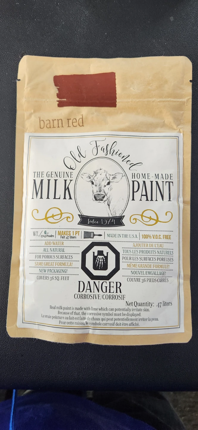 This is a bag of Old Fashioned Milk Paint in Barn Red. It's a genuine home-made paint that makes 1PT. It's all natural and suitable for any surface. New packaging and same great formula!