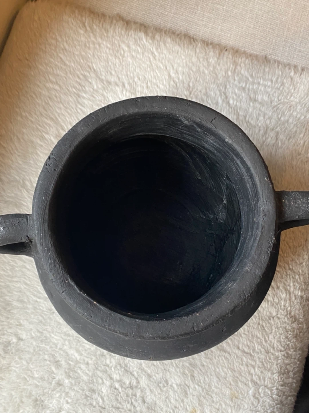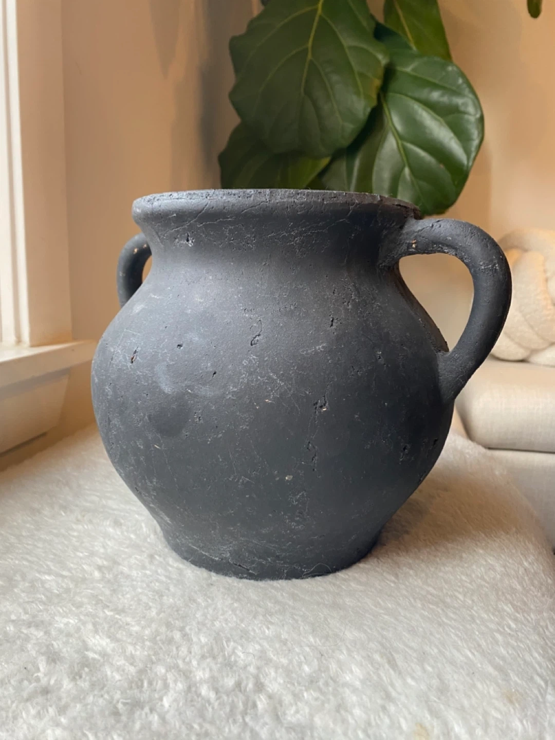 A decorative matte black ceramic vase with two handles. Its textured ceramic finish gives it a rustic charm. It's perfect for adding a touch of natural decor to any shelf or tabletop.