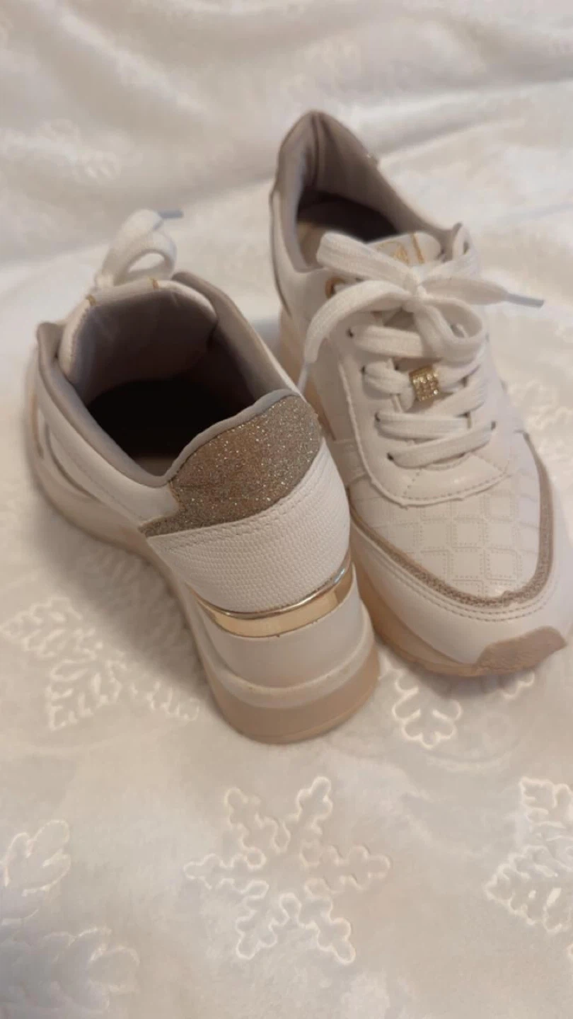 These stylish wedge sneakers are white with gold accents and a glitter detail on the heel. They're lace-up style with a padded collar. Good for adding a bit of height while staying comfortable!