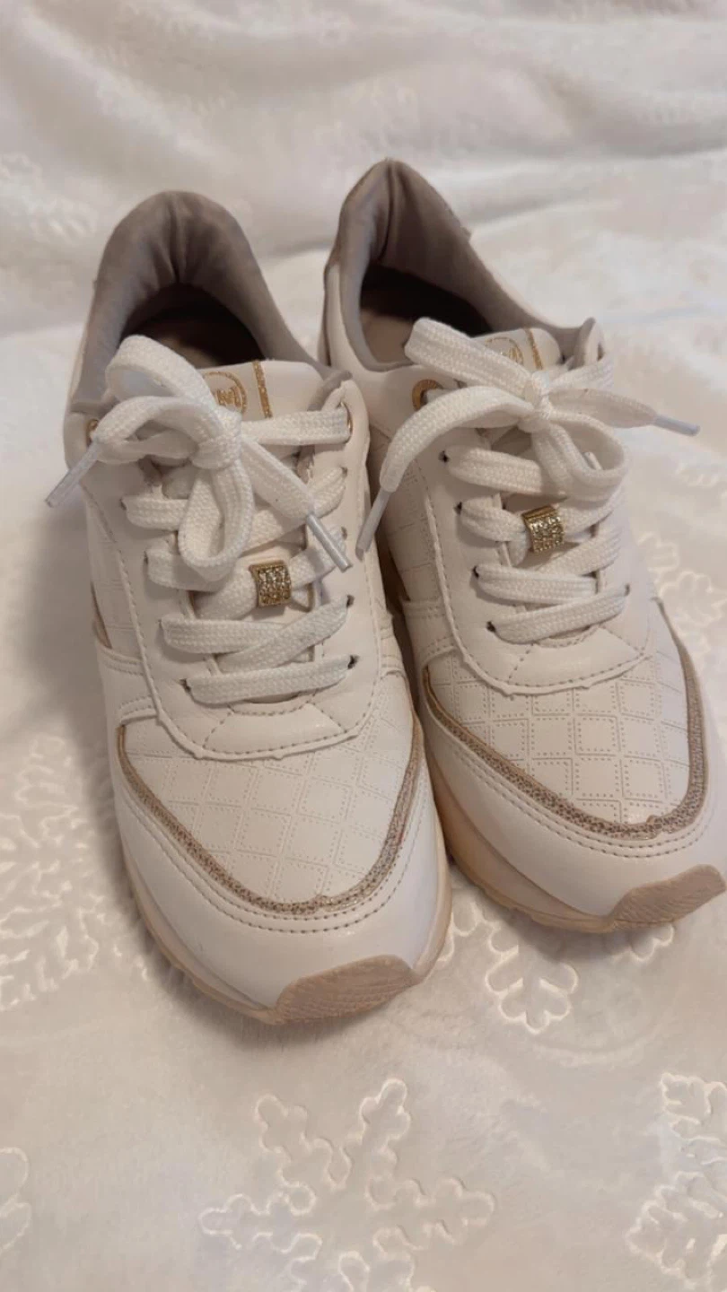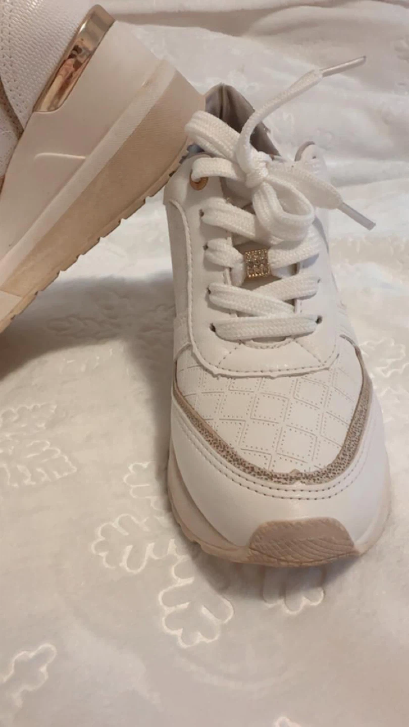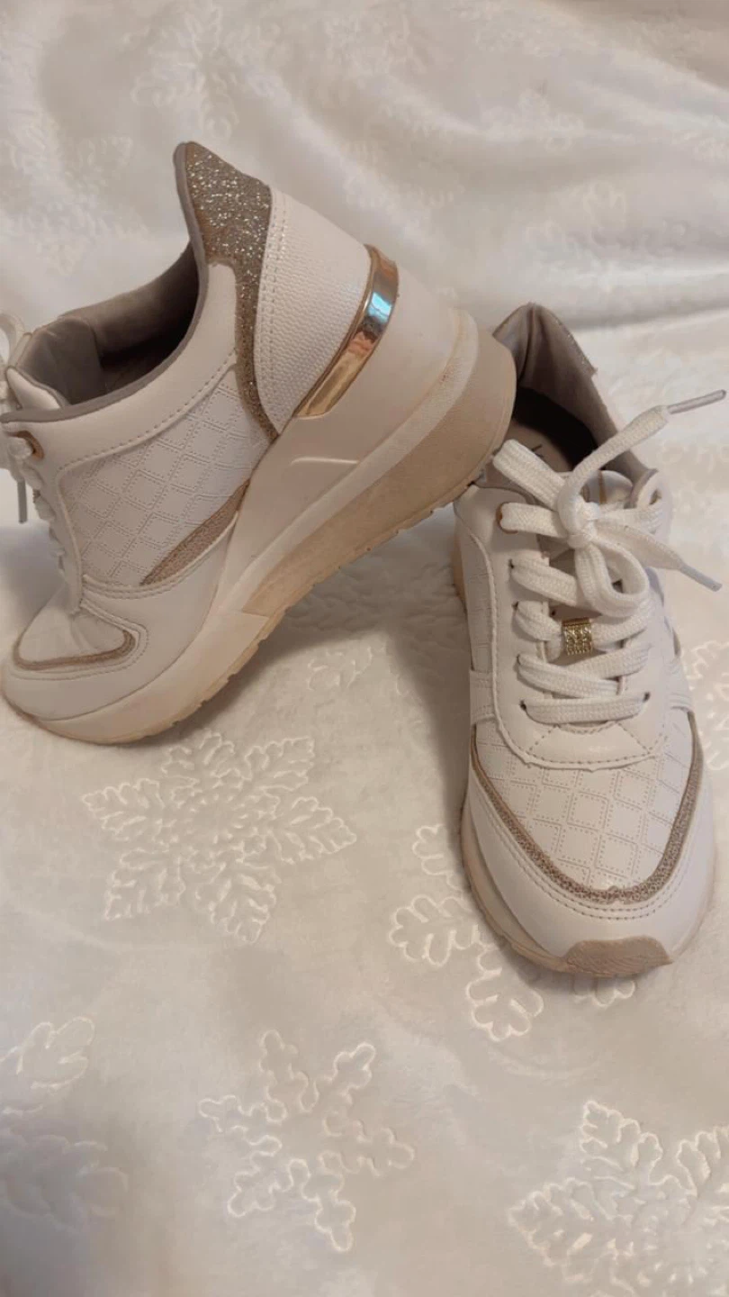 These stylish wedge sneakers are white with gold accents and a glitter detail on the heel. They're lace-up style with a padded collar. Good for adding a bit of height while staying comfortable!