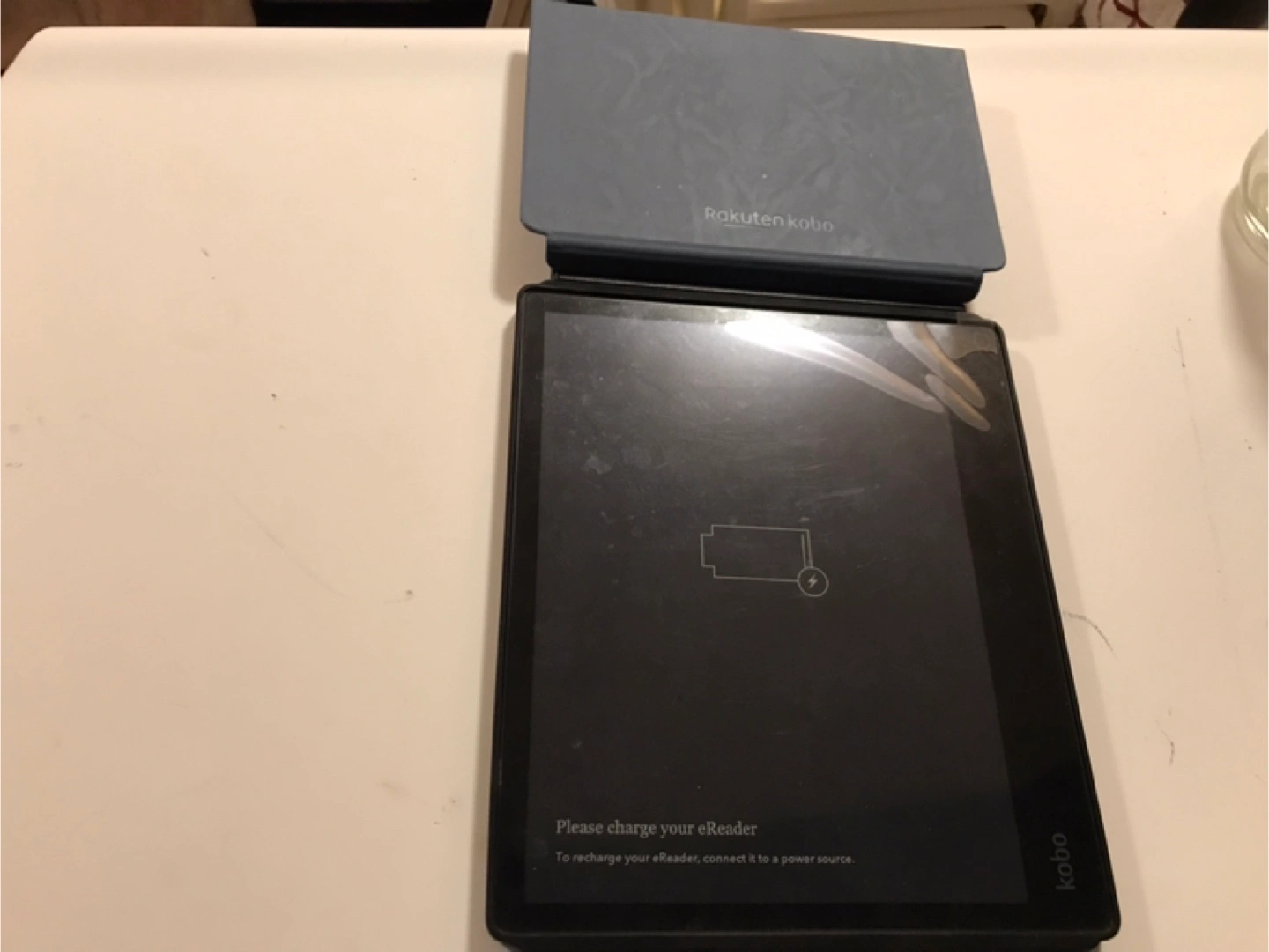 Kobo eReader needs charging. Comes with a blue case. Good for reading.