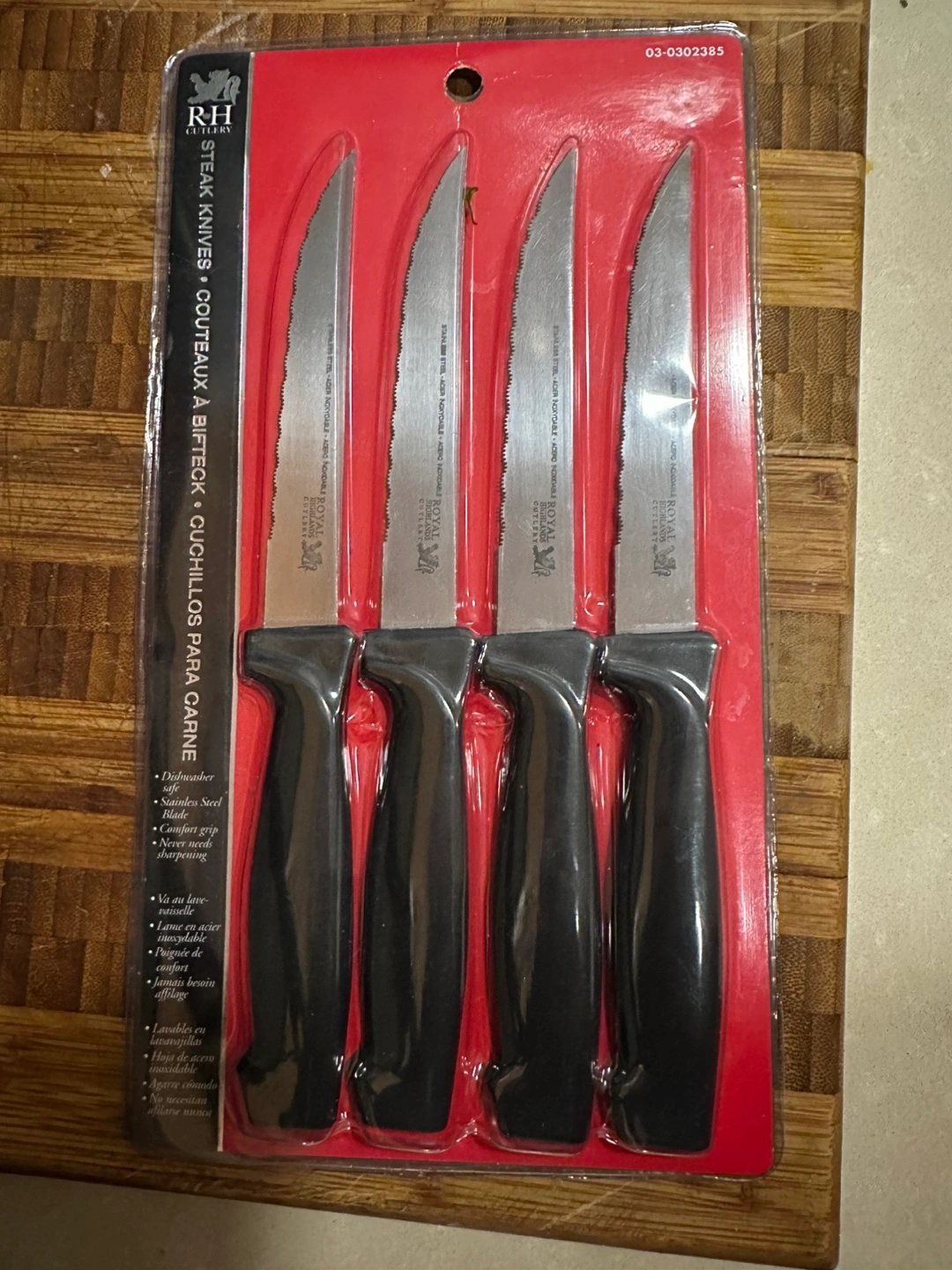 New in package. Set of four steak knives. Stainless steel blades. Comfortable grip handles. Dishwasher safe.