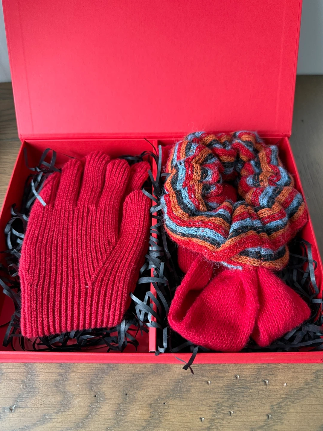 Here's a lovely red knitted gloves and scarf set, perfect for staying warm and stylish! The set includes a pair of gloves and a matching scarf, all neatly presented in a box. The material is soft and cozy, ideal for those chilly Canadian days.