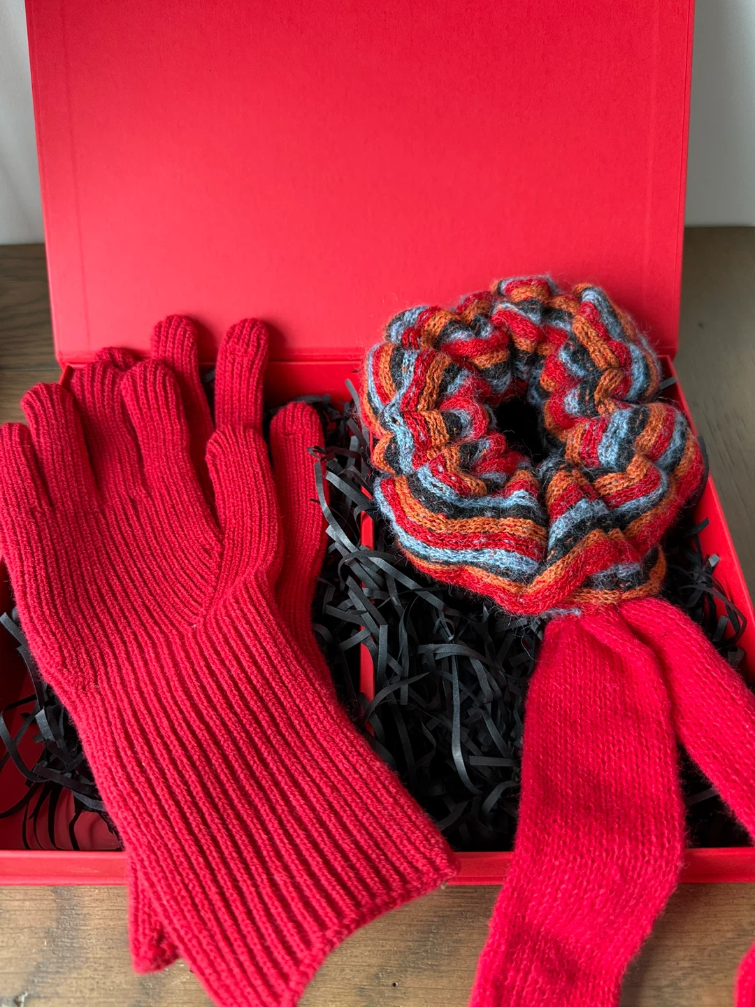 Here's a lovely red knitted gloves and scarf set, perfect for staying warm and stylish! The set includes a pair of gloves and a matching scarf, all neatly presented in a box. The material is soft and cozy, ideal for those chilly Canadian days.