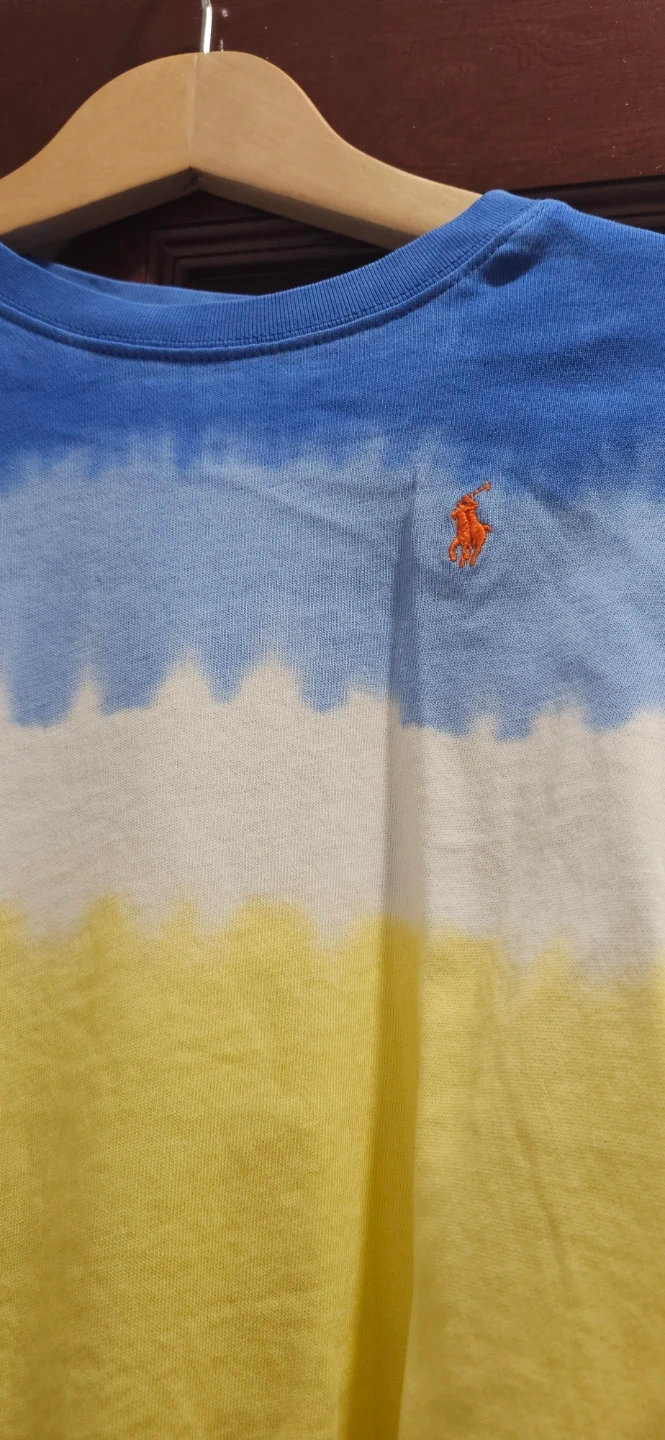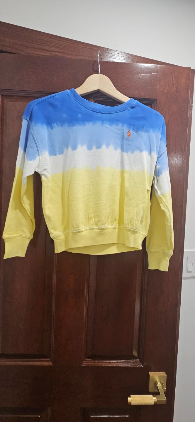 This Polo Ralph Lauren sweatshirt features a blue, white, and yellow tie-dye pattern. It's a size medium, fitting 8-10 years. The material is a comfortable blend.