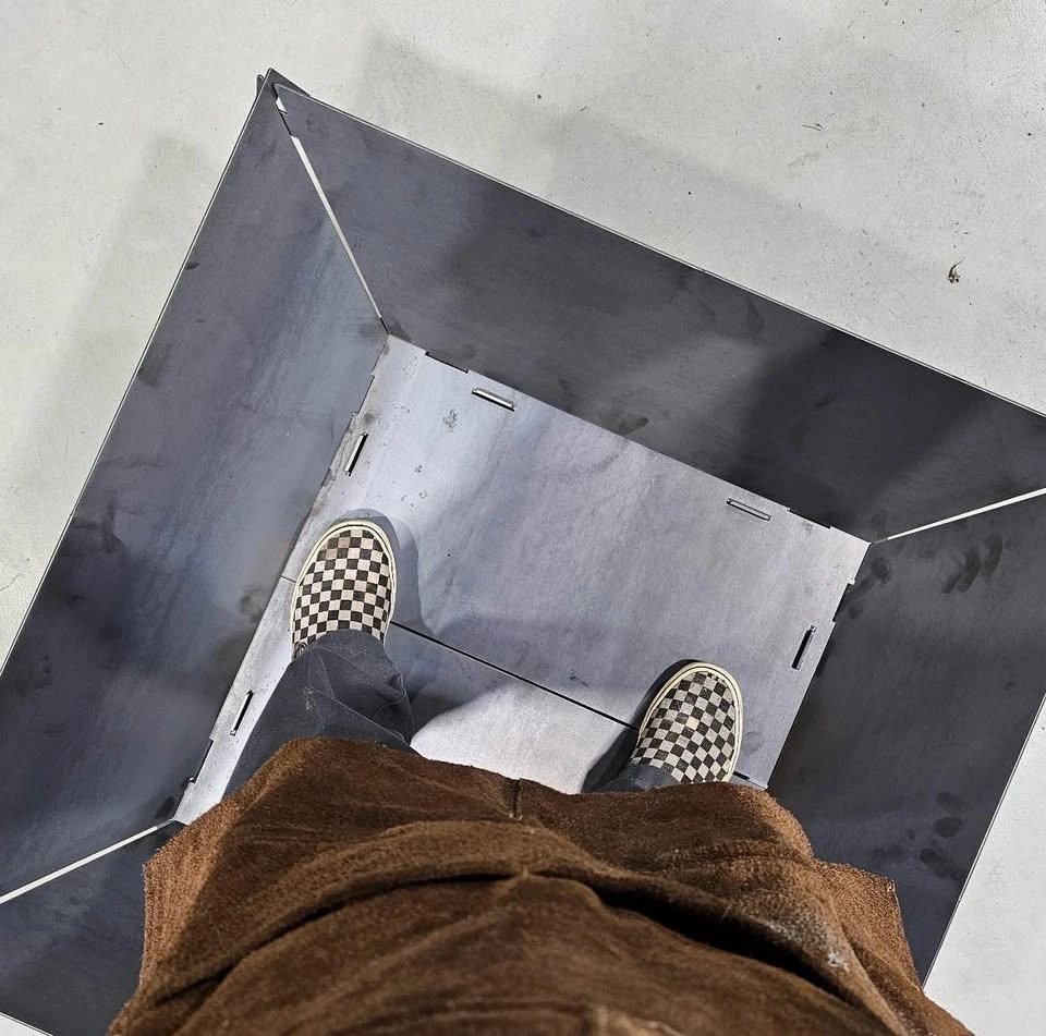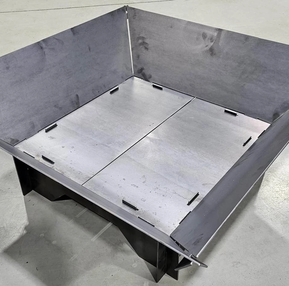 Snap together fire pit. For use when camping or when limited on space. When disassembled the complete fire pit is only 12 x 35 x 1.5. This fire pit snaps together in under a minute with no tools or fasteners. When assembled it’s approximately 35 x 35 x 12 tall. Can do custom logos for an extra $10. Made from 1/8 mild steel.