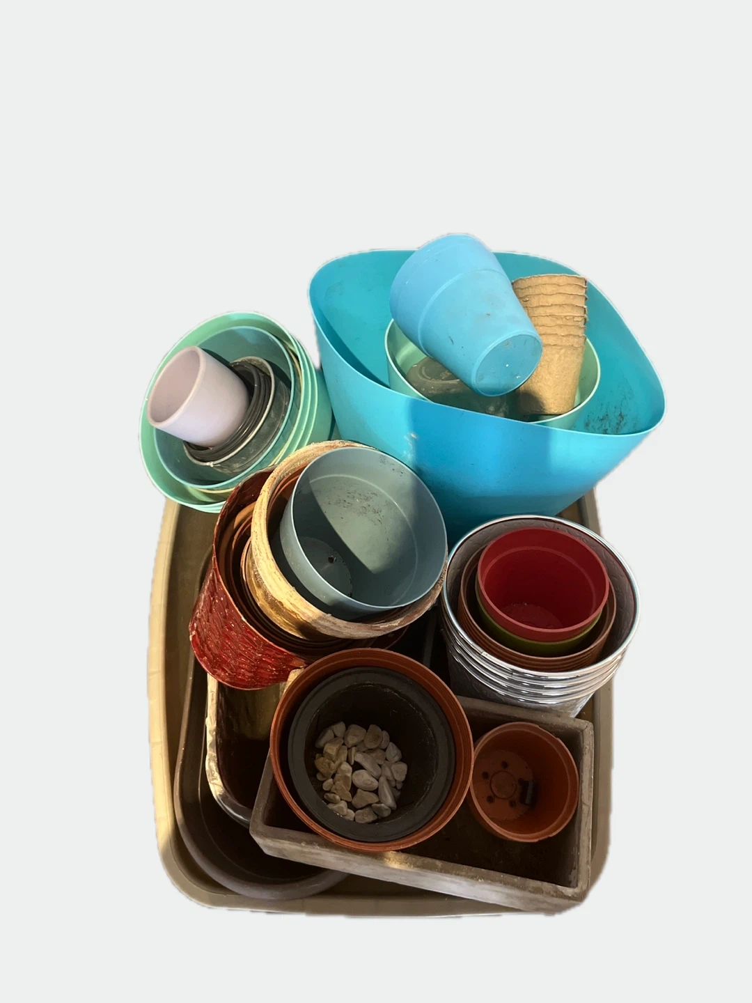 A collection of various plastic and peat pots for your gardening needs. Includes different sizes and colours. These pots are great for starting seedlings or repotting houseplants.