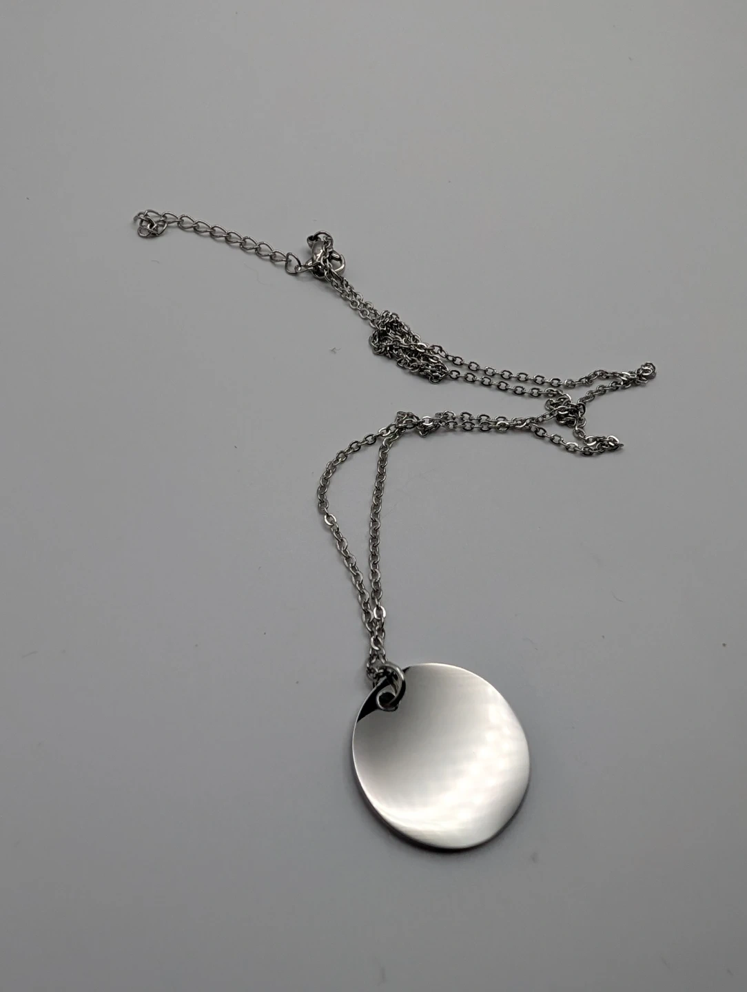 A simple silver-tone necklace with a round pendant. It has an adjustable chain. This necklace is silver in colour. Stainless steel