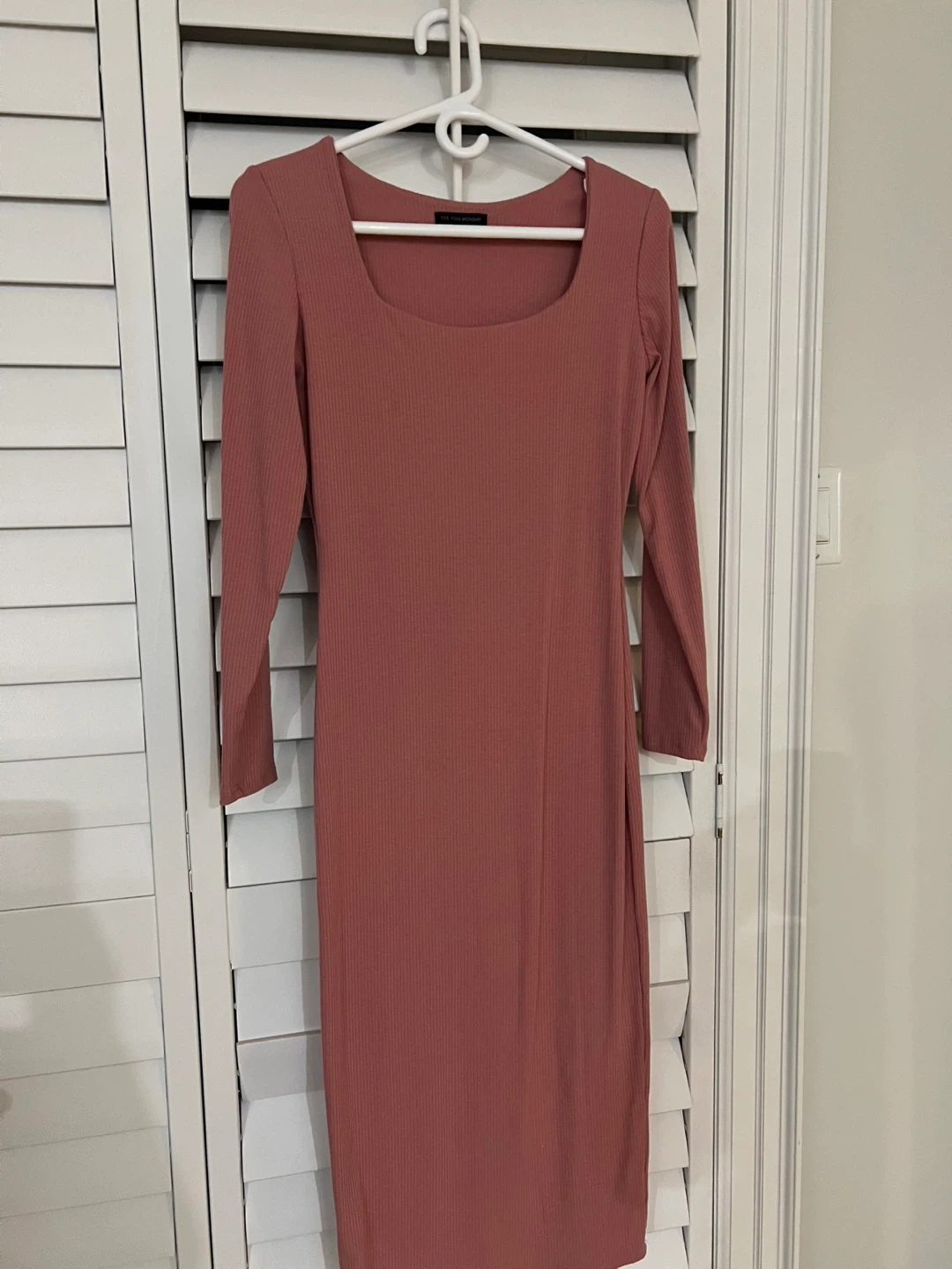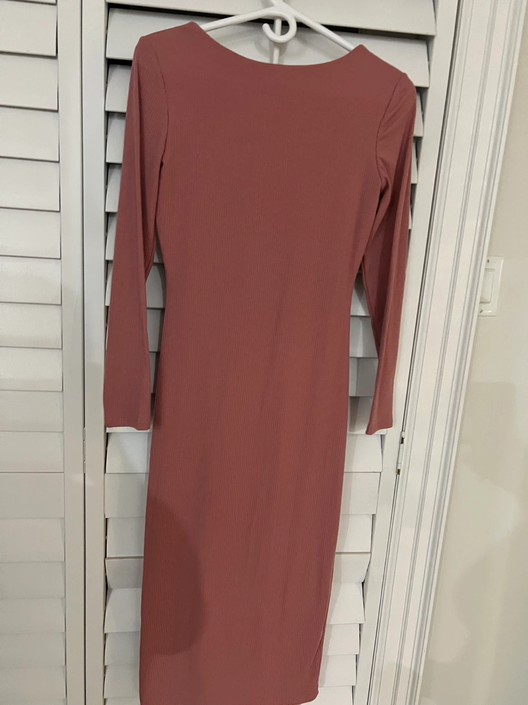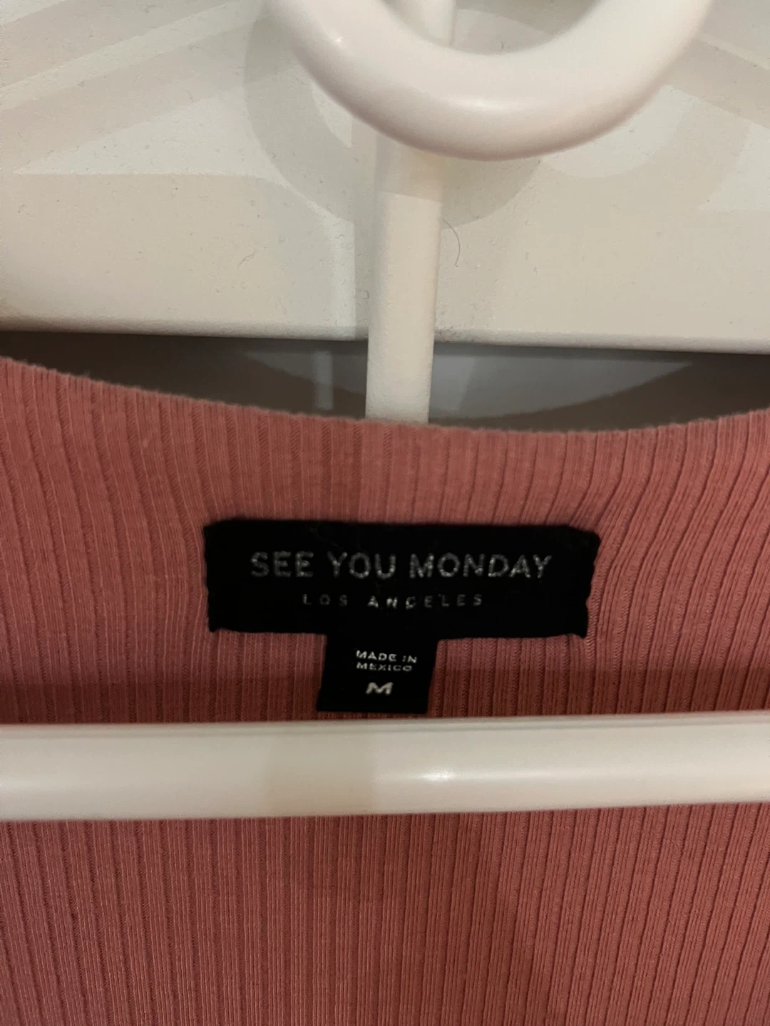 This is a long-sleeved ribbed midi dress from See You Monday. It's a size medium and made in Mexico. The fabric has a soft, comfortable feel.