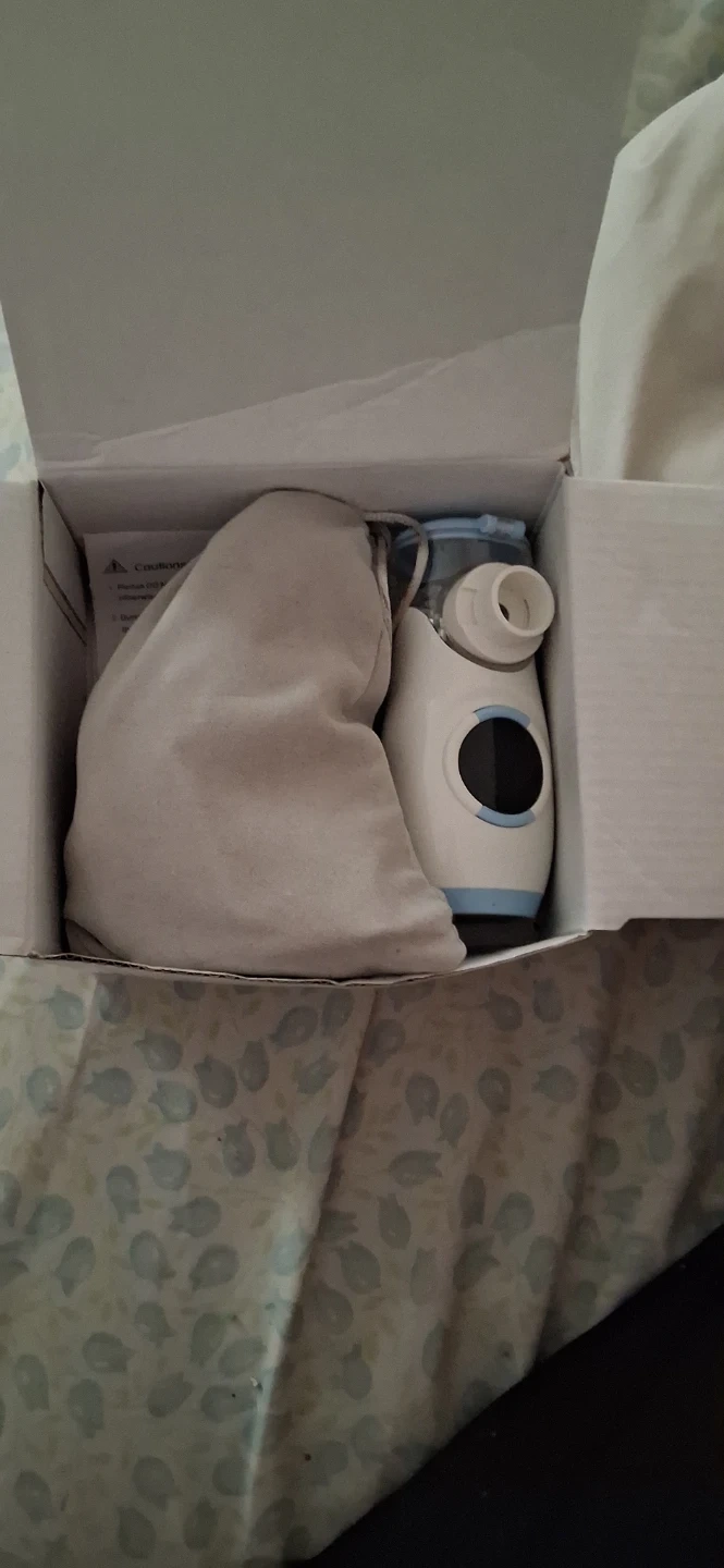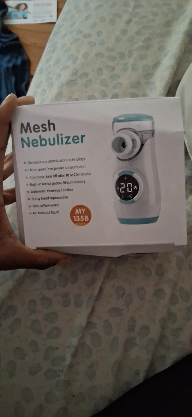 This is a mesh nebulizer with microporous atomization technology. It features ultra-quiet, low power consumption and a built-in rechargeable lithium battery. Includes automatic shut-off after 10 or 20 minutes and a spray head replaceable.