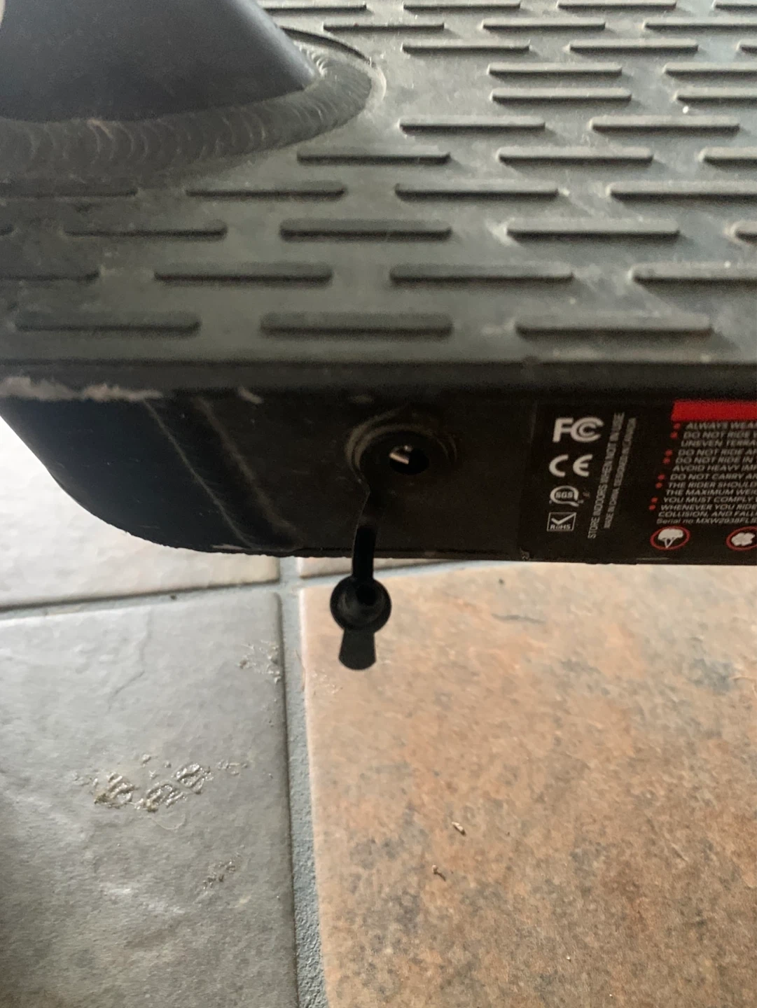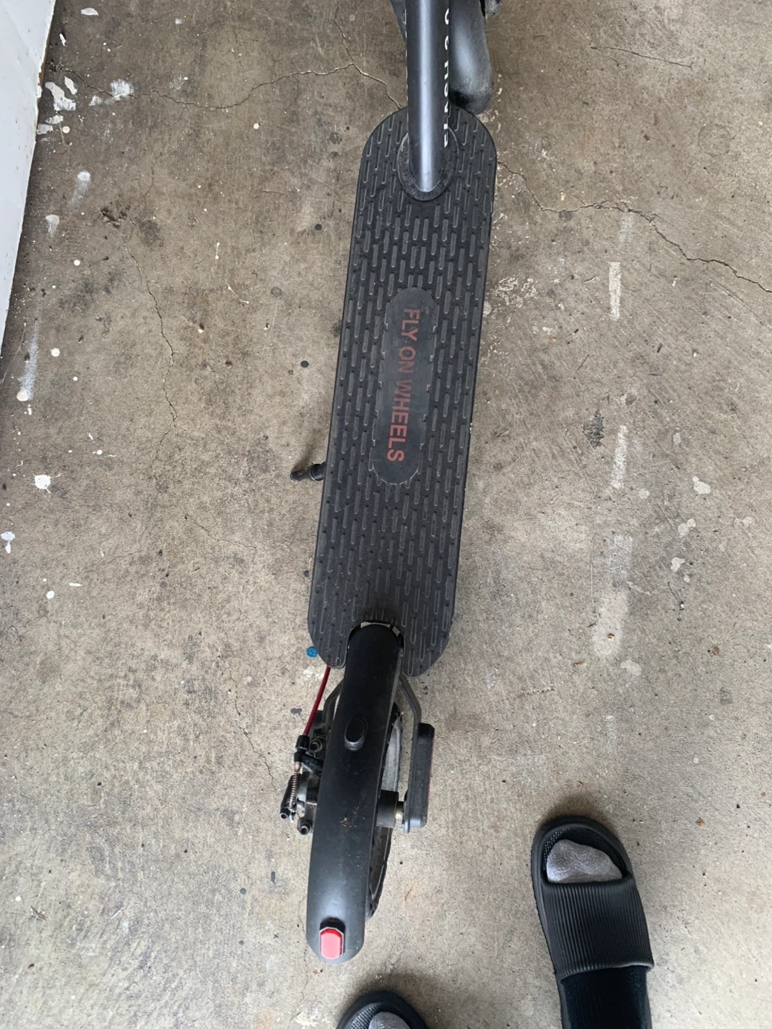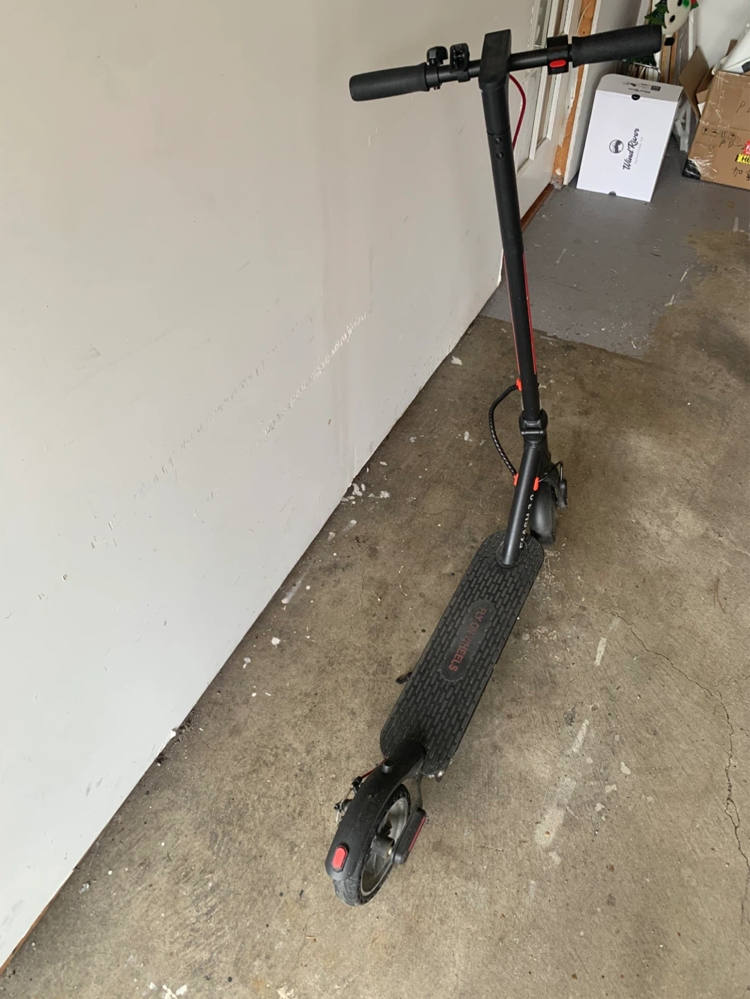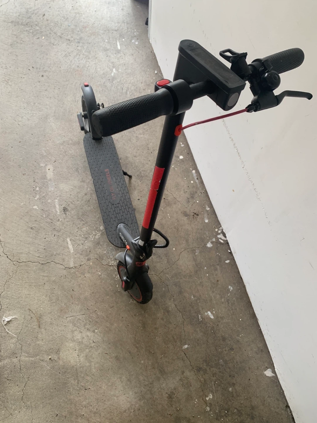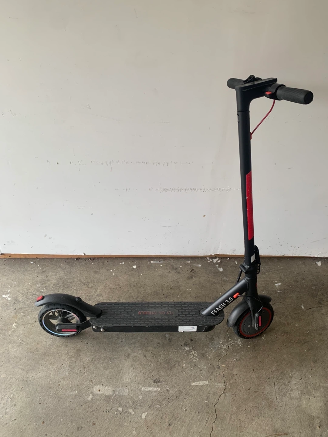 This is a Fly on Wheels Flash 3.0 electric scooter in black with red accents with charger. It has a textured deck for grip.