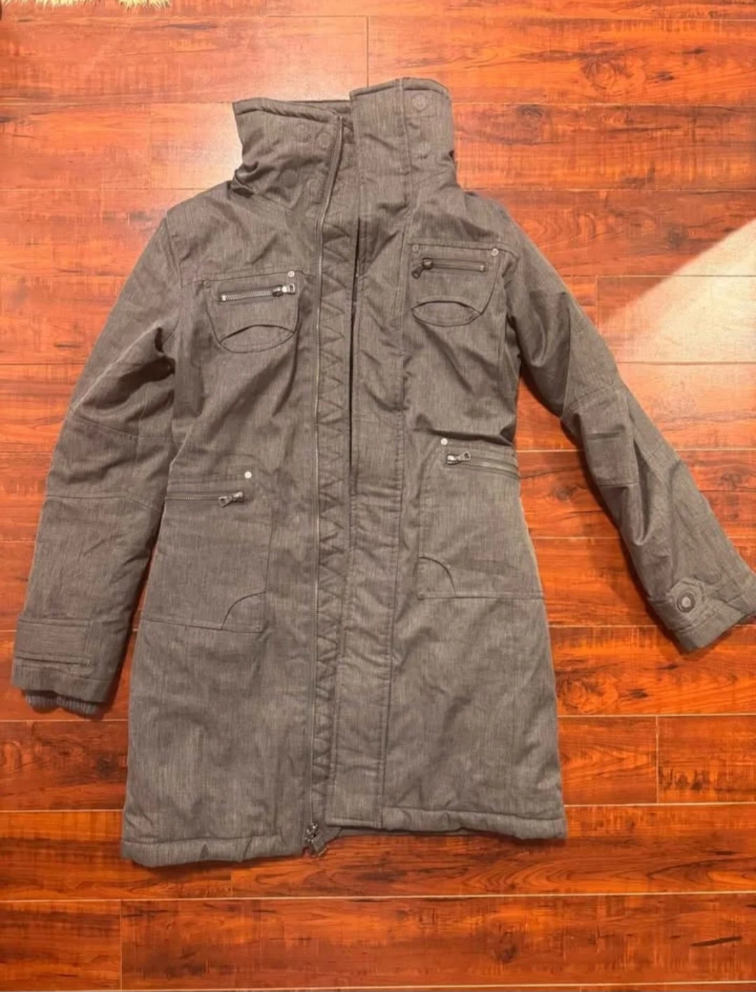 TNA women's grey parka jacket. Exterior 100% polyester. Lower body and sleeve lining 100% polyester. Upper lining 100% acrylic. Knit trim 80% wool, 20% acrylic. Fill 100% polyester. Acrylic in backing.