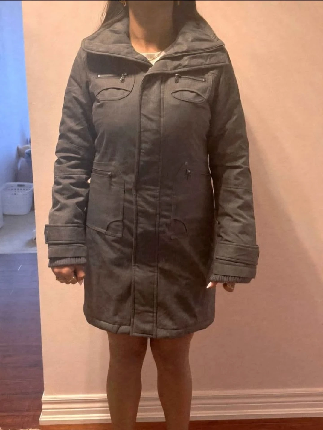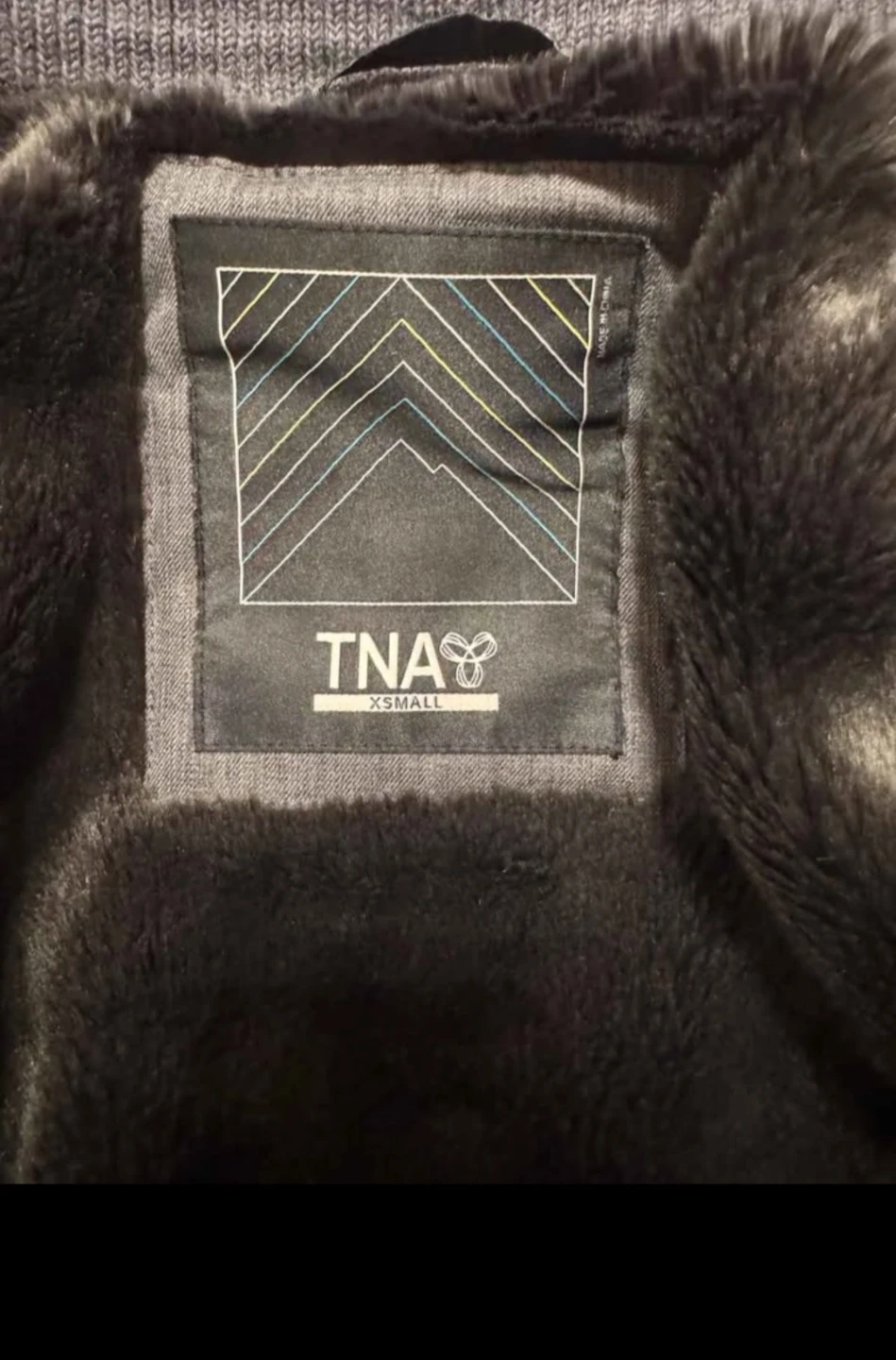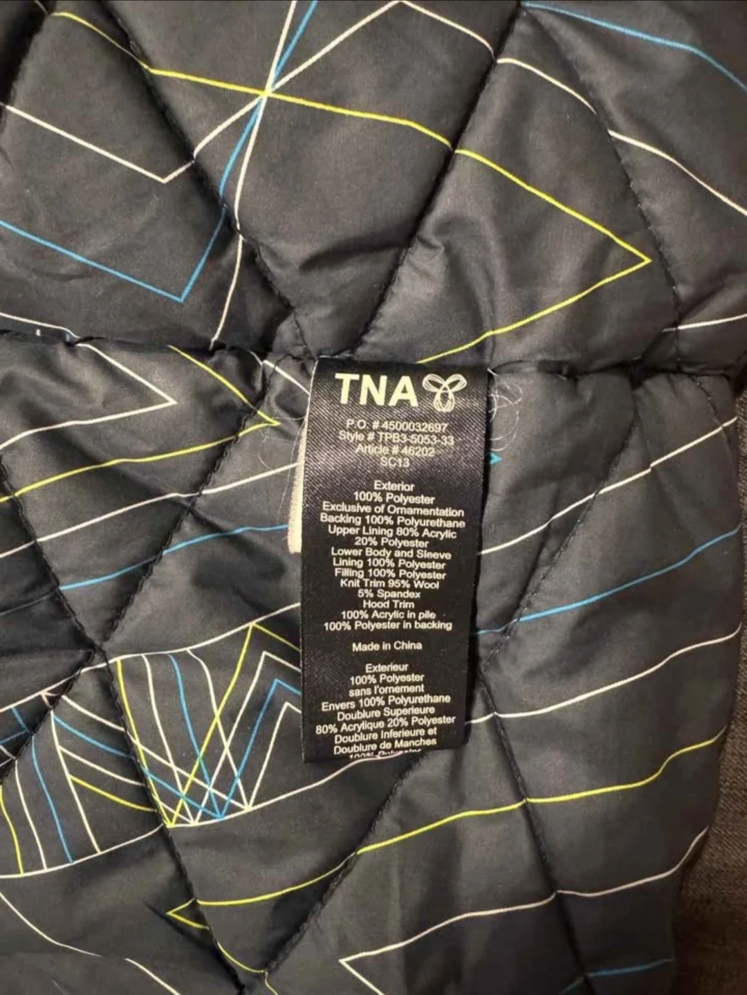TNA women's grey parka jacket. Exterior 100% polyester. Lower body and sleeve lining 100% polyester. Upper lining 100% acrylic. Knit trim 80% wool, 20% acrylic. Fill 100% polyester. Acrylic in backing.