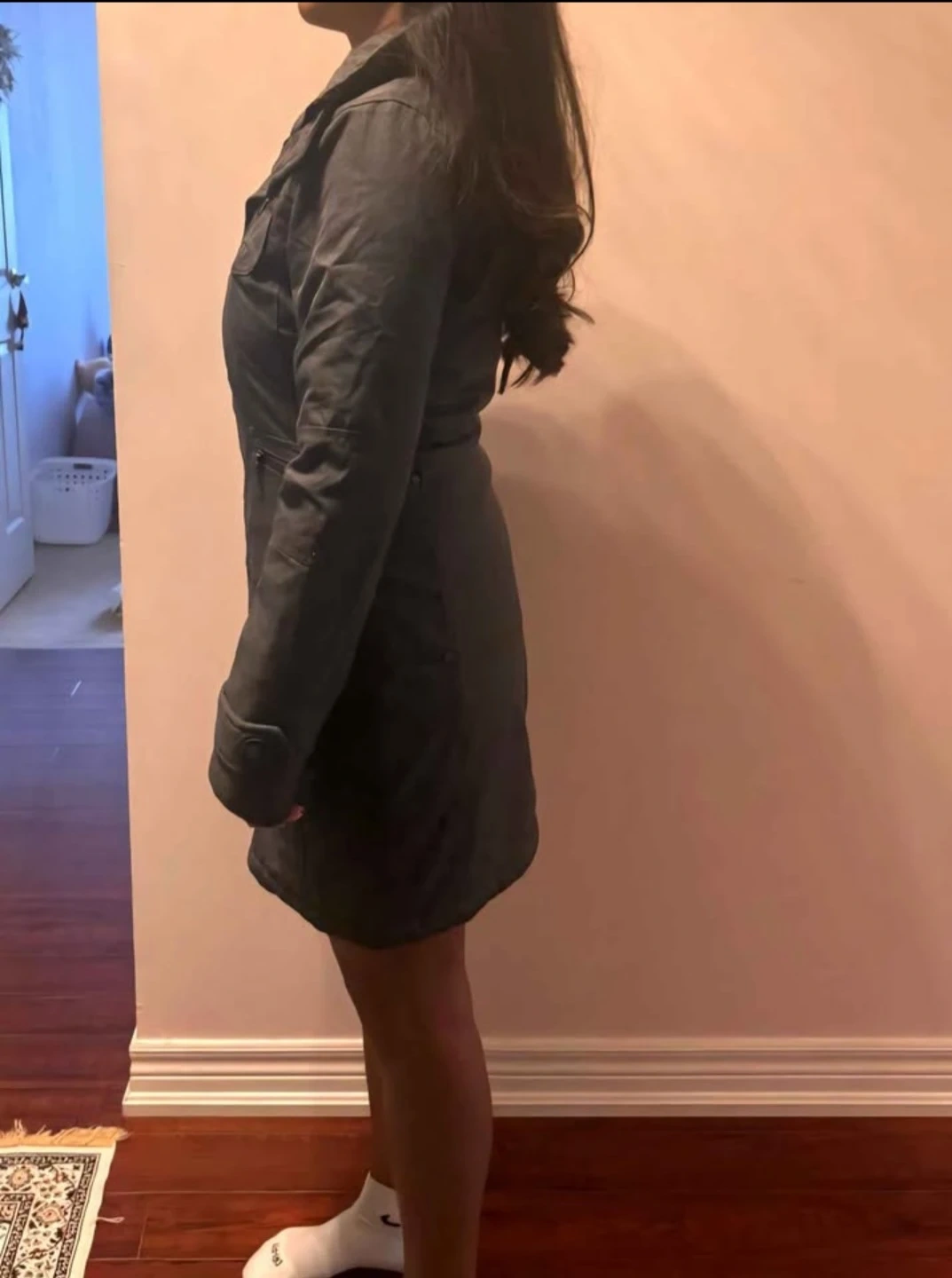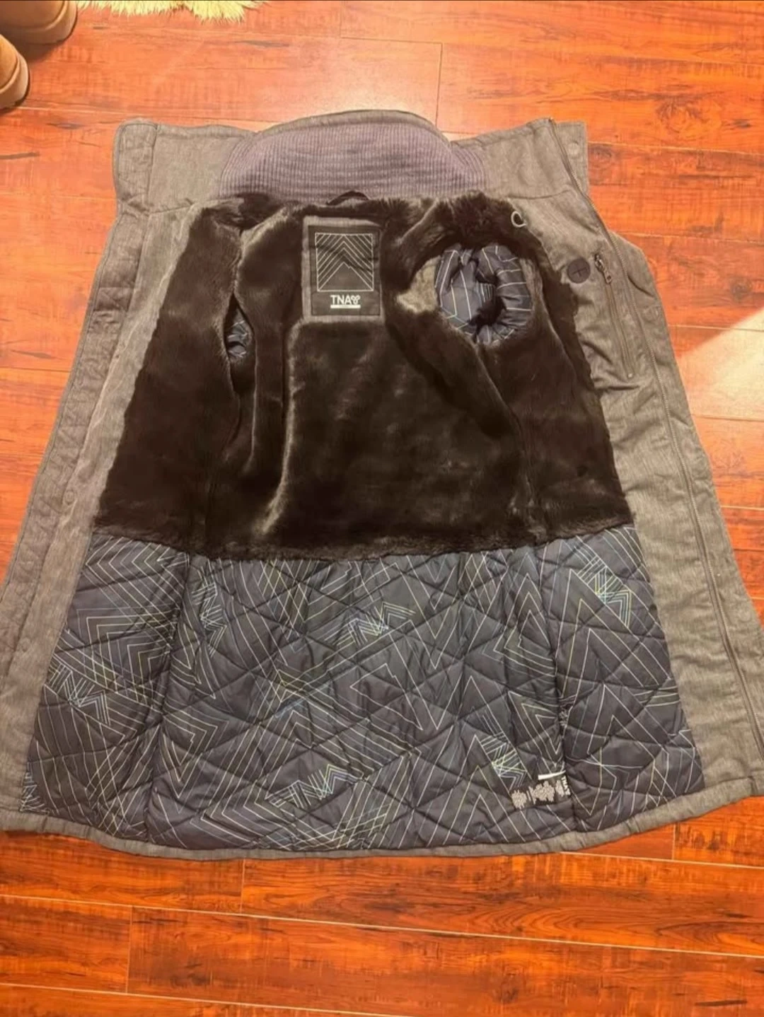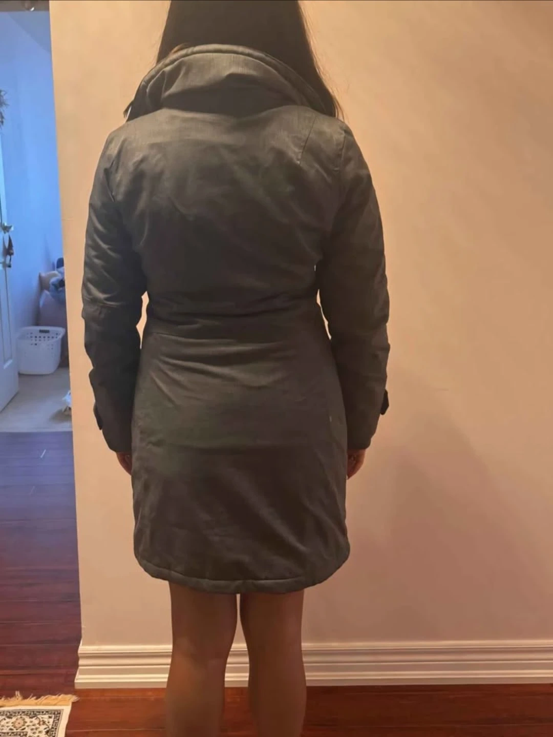 TNA women's grey parka jacket. Exterior 100% polyester. Lower body and sleeve lining 100% polyester. Upper lining 100% acrylic. Knit trim 80% wool, 20% acrylic. Fill 100% polyester. Acrylic in backing.