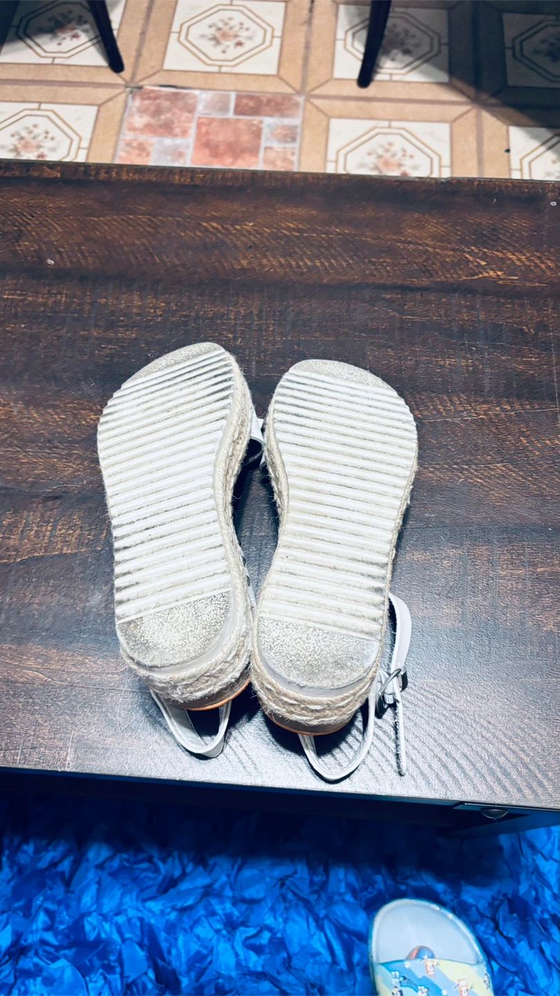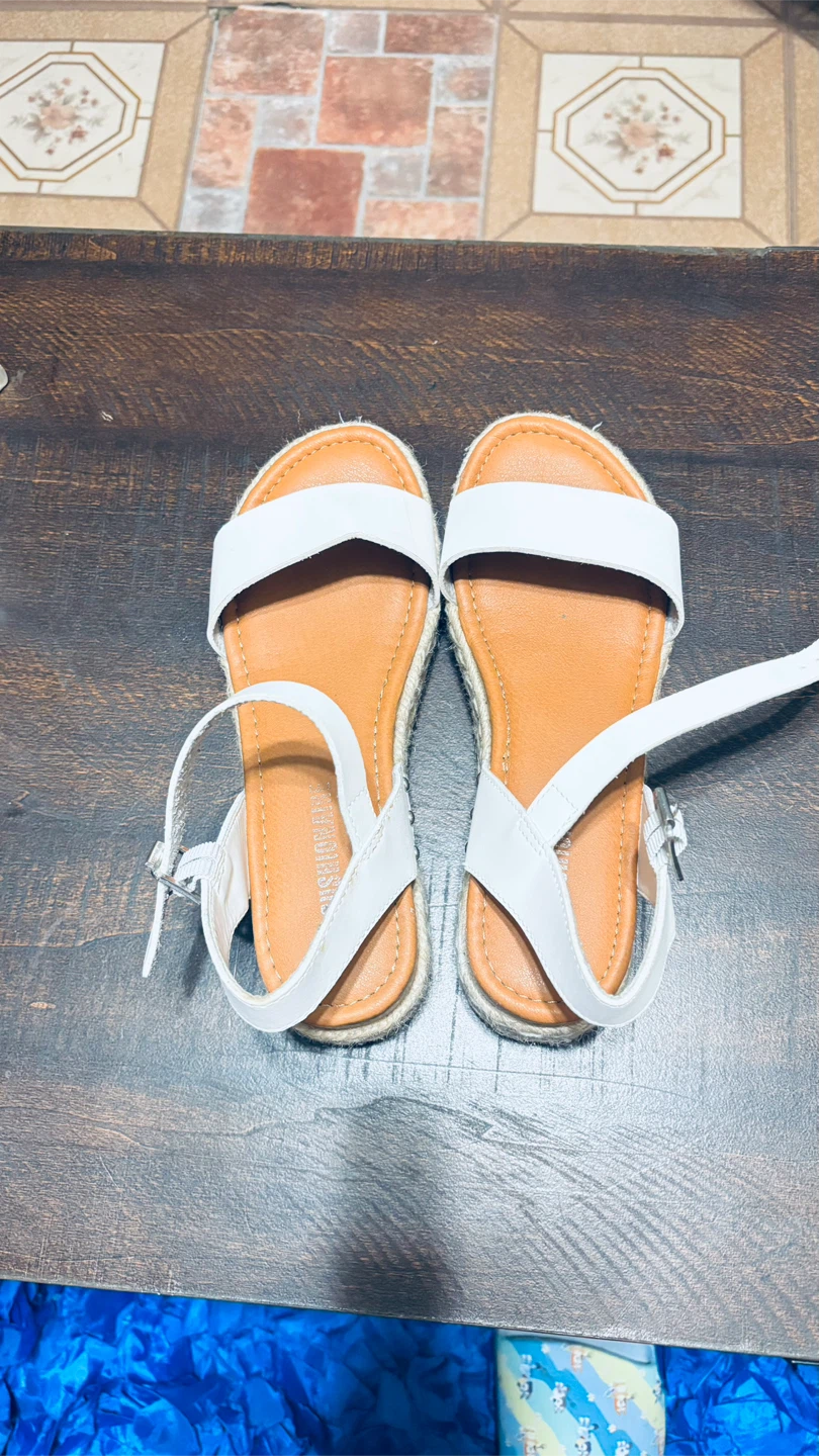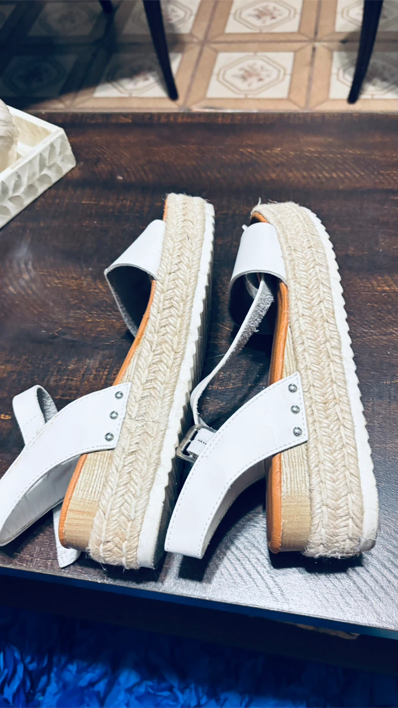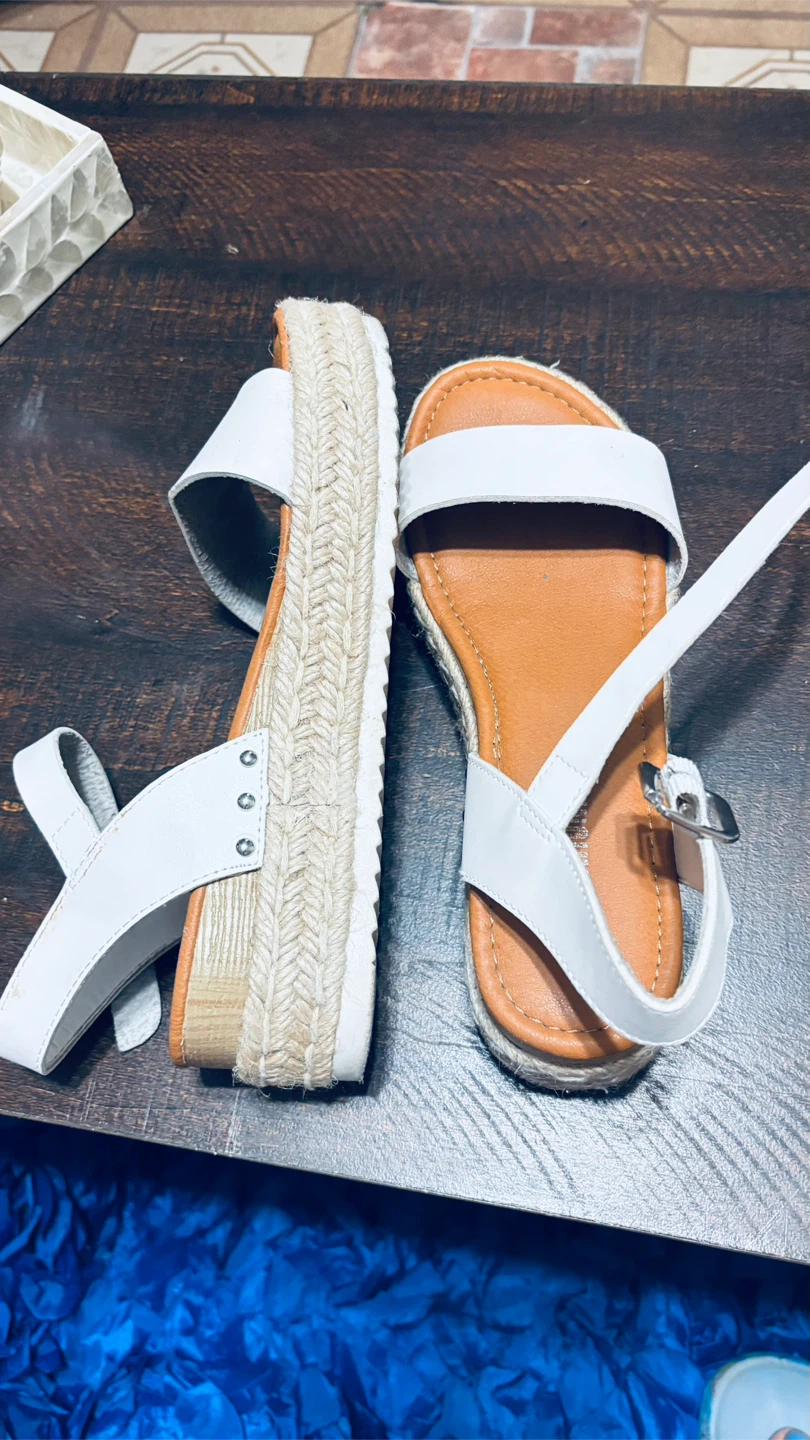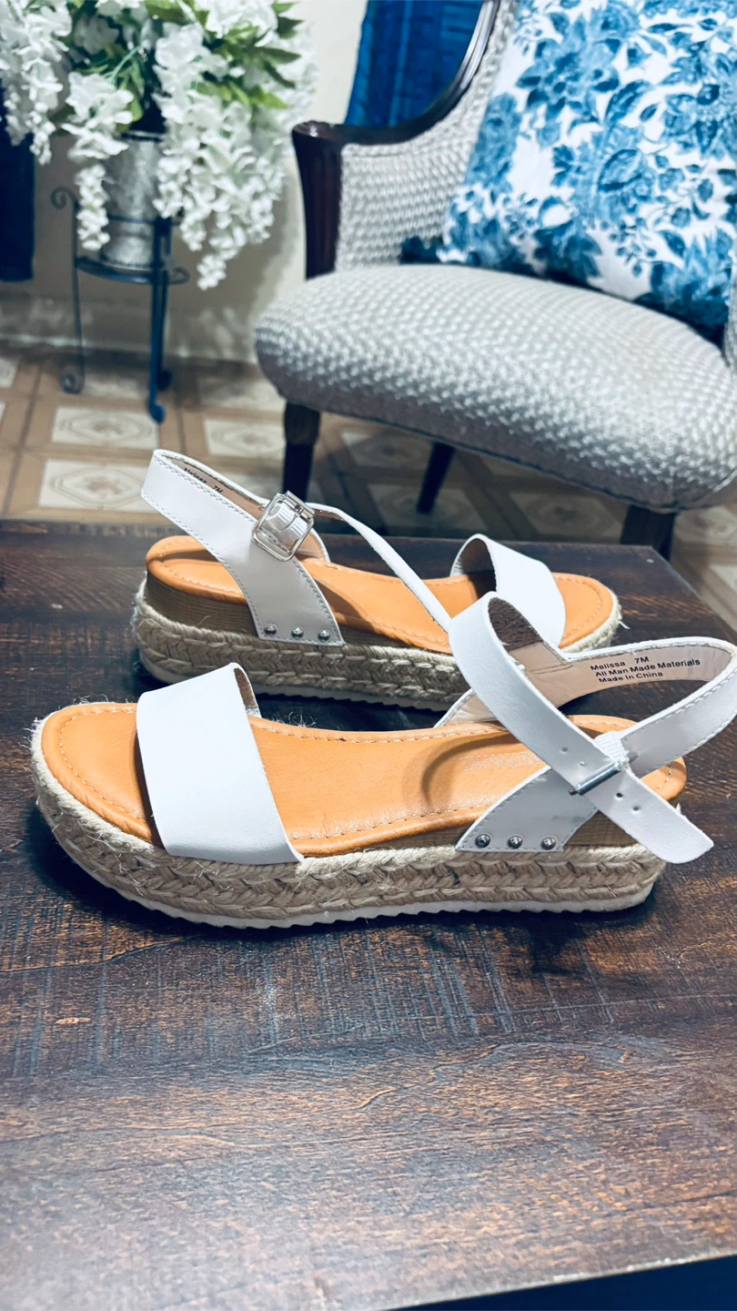 White espadrille platform sandals with adjustable ankle straps. Features a tan footbed and jute-wrapped sole. It's a stylish and comfortable choice for warm weather!